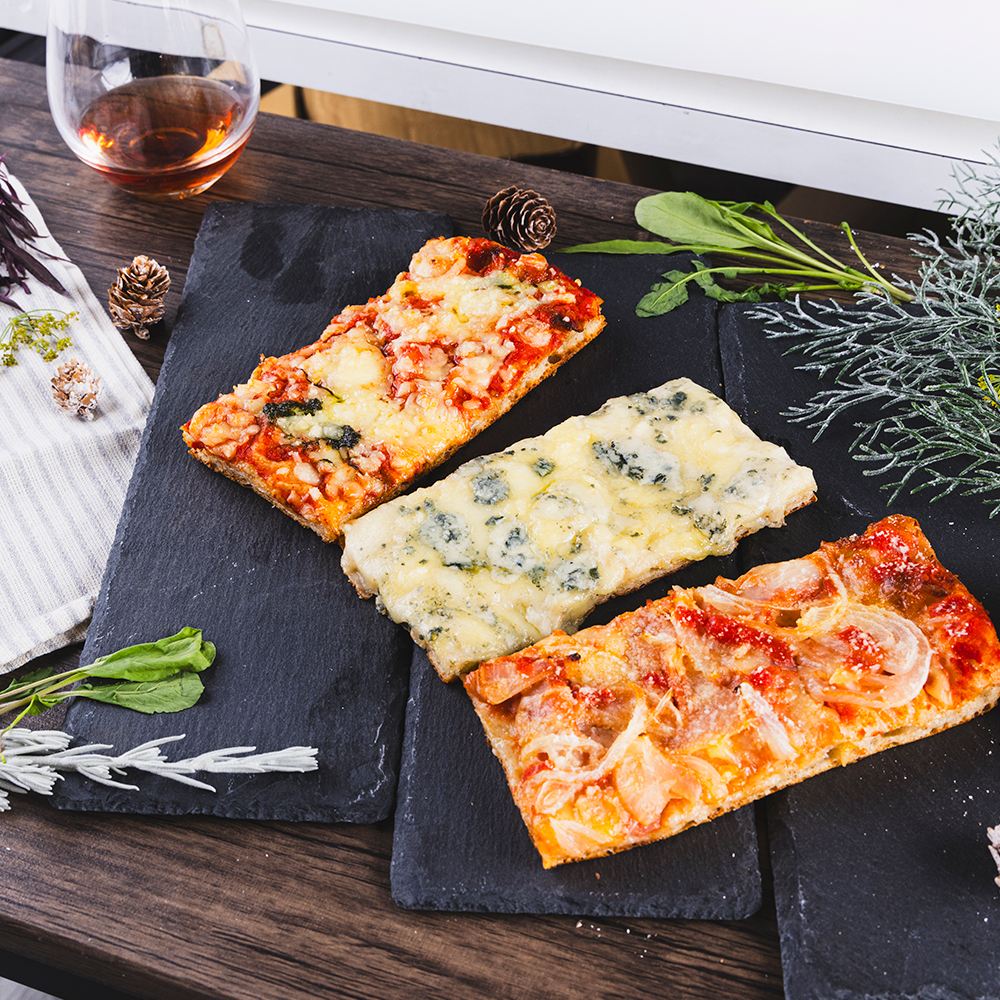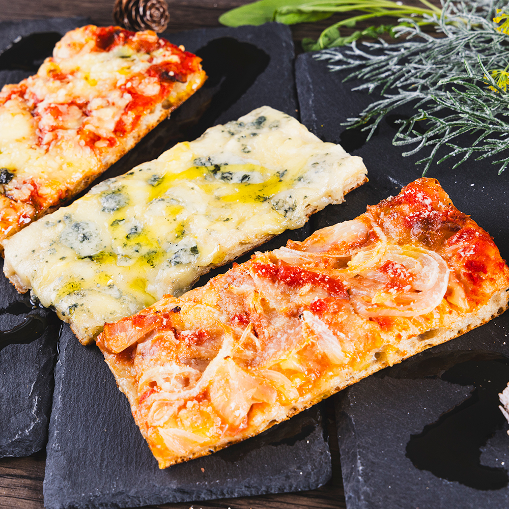 本場ローマの四角い切り売りピッツァを食べやすい大きさにカットして瞬間冷凍しています。