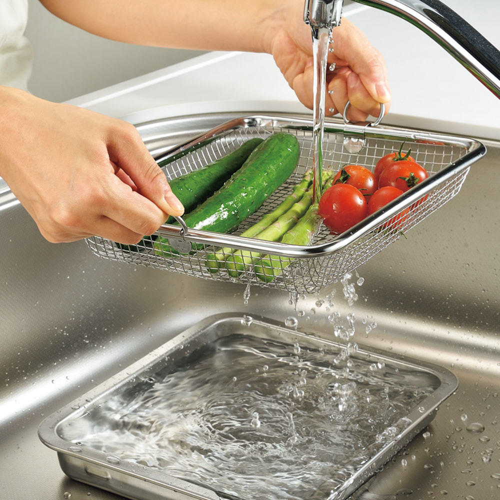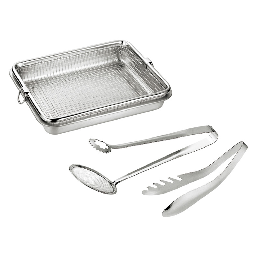 ステンレスバット(25.2×20.5×3.5cm)・角ザル(24.5×19.8×3.6cm)・揚げ物トング・ハンドトング×各1・ステンレス鋼