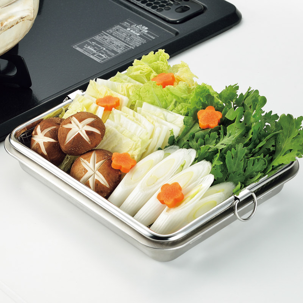 揚げ物の油切りや鍋具材の盛り付けなどに便利なザル付き。