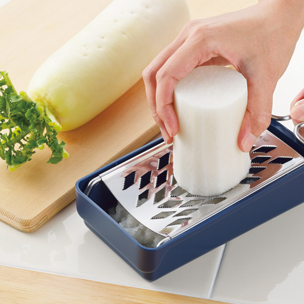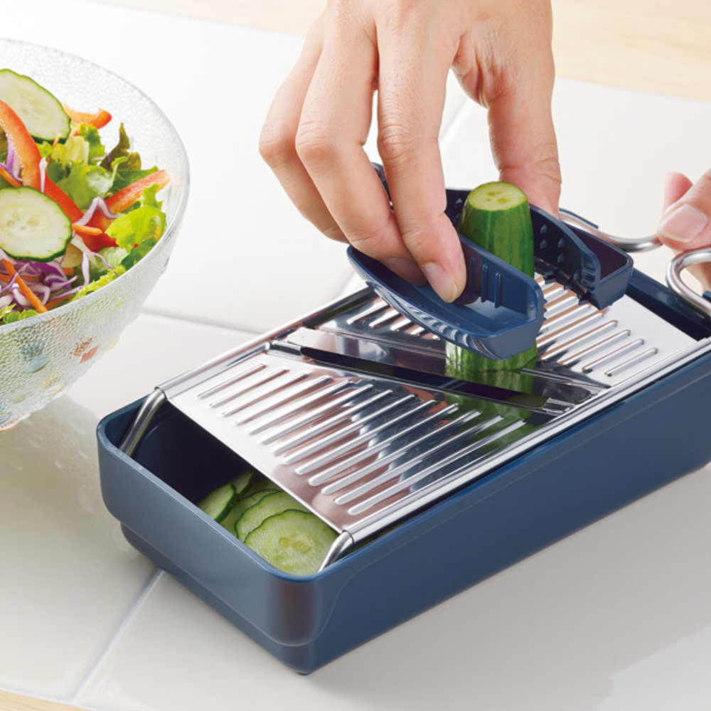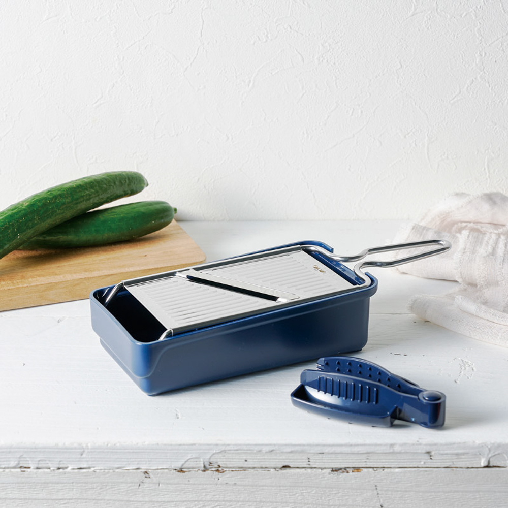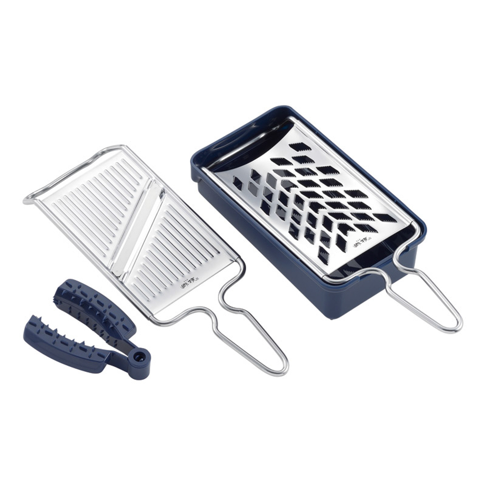 | 内容量 | 容器(18.6×10.1×5.4cm)・安全ホルダー(10×7×2.7cm)・スライサー(27×9.7×2.7cm)・おろし(27×9.7×2.4cm)×各1・ポリプロピレン、ABS樹脂、ステンレス |