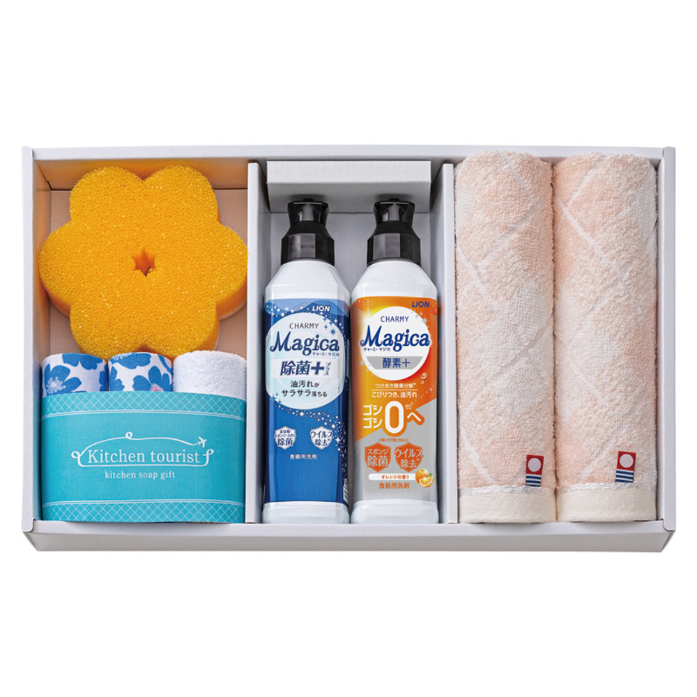 ナノ洗浄でベタつく油汚れもサラサラ落とす食器用洗剤・チャーミーマジカと、今治タオルやマイクロファイバークロスがセットになった、役立つキッチン洗剤ギフトです。