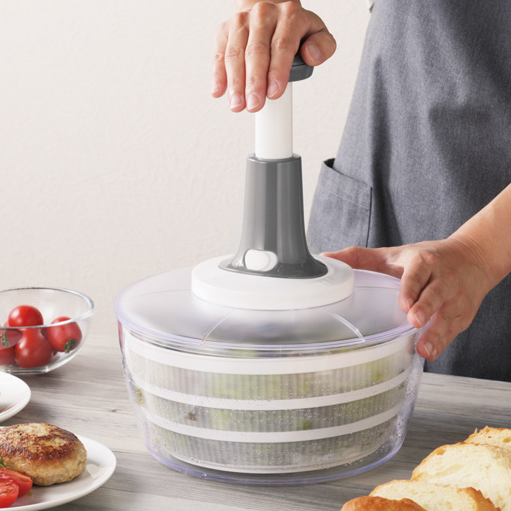 着脱ハンドルでサラダスピナーとフードプロセッサーに簡単切り替え。押すだけで簡単に水切り、みじん切りが行えます。