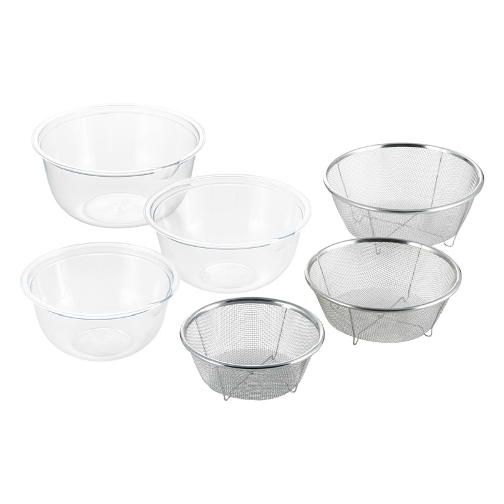 | 内容量 | ボウル大(径21×9.7cm・1.9L)・ボウル中(径19×8.7cm・1.3L)・ボウル小(径17×8cm・900ml)・ザル大(径19×7.6cm)・ザル中(径17×6.2cm)・ザル小(径15×6cm)×各1・ボウル:ポリメチルペンテン、ザル:18-8ステンレス |