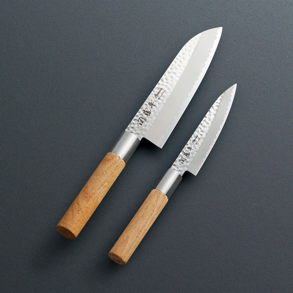 三徳包丁(刃渡16.5cm)・ペティ(刃渡12cm)×各1・刃:ステンレス刃物鋼、柄:天然木(オーク)