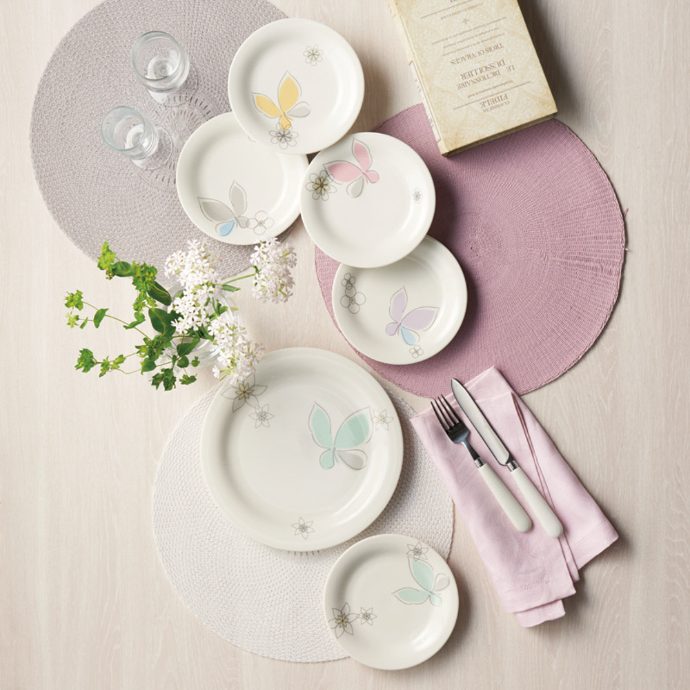 ハナエモリのシンボルマークでもある蝶が優雅に描かれた大小のプレートセットです。