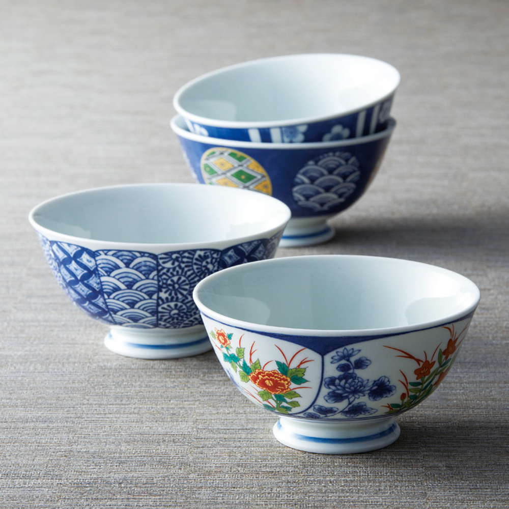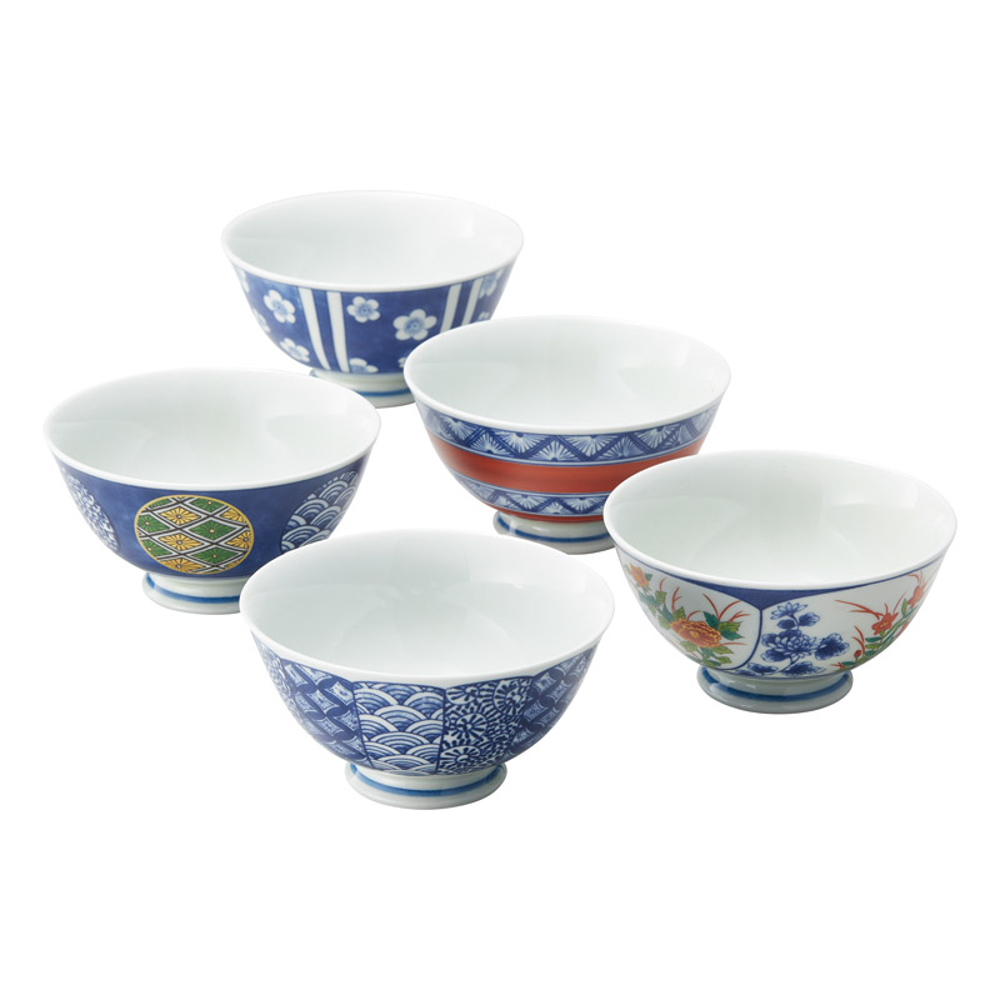 地紋や色絵、花絵で構成された五文様 日々、毎食に使うお茶碗のセットです。