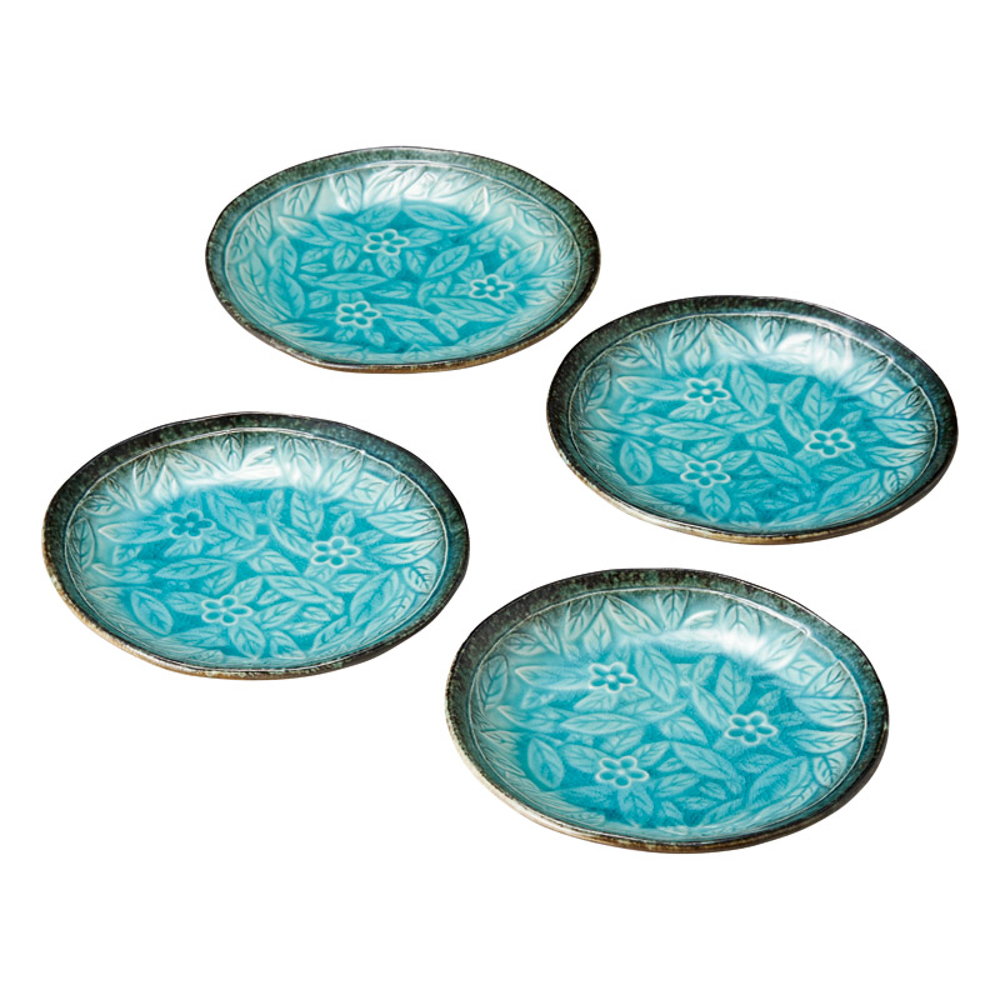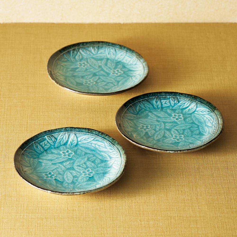 花柄のレリーフが入ったスカイブルーの重厚感のあるお皿です。