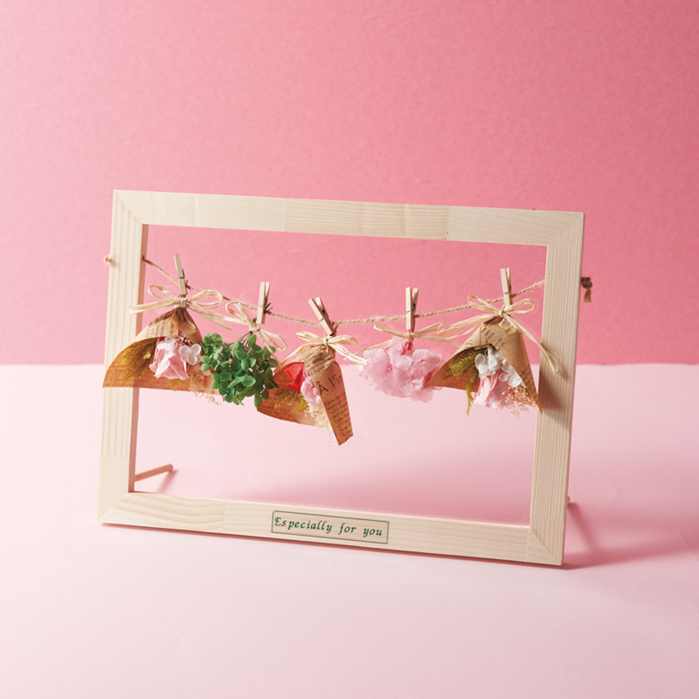 ブリザーブドフラワーのガーランドにナチュラルなフレームを付けました。フレームの後ろには透明のアクリル板がついています。