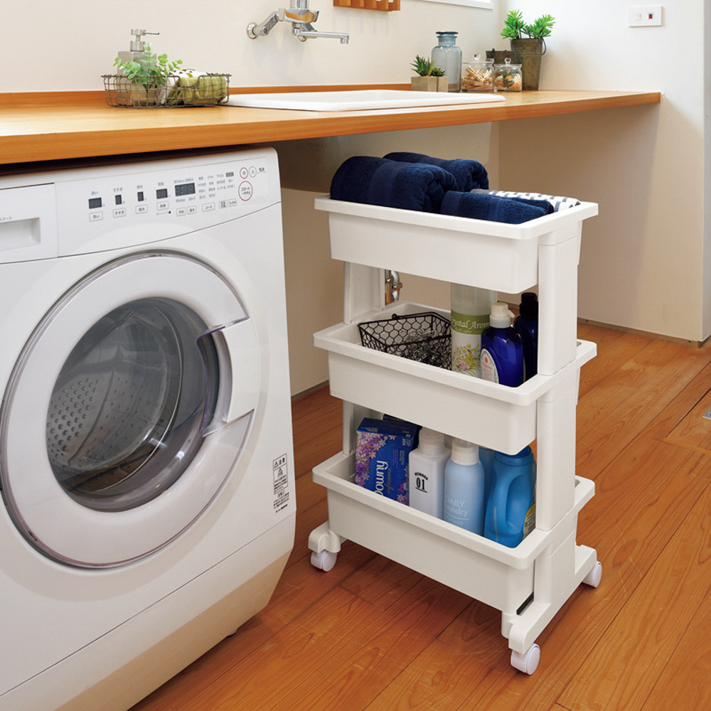 キッチンでは乾物類などストック品の収納に、サニタリーではタオル類の収納に。