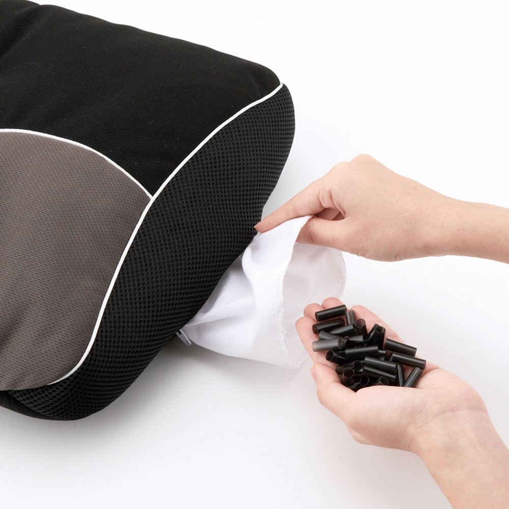 首と肩口にやさしくフィットする形状&木炭練り込みパイプでしっかり頭を支えます。