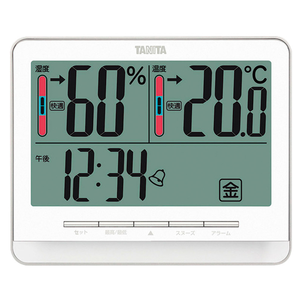 時計機能(スヌーズ機能付)、測定範囲:温度-5.0~45.0度/湿度20~95%、一目盛:温度0.1度/湿度1%。