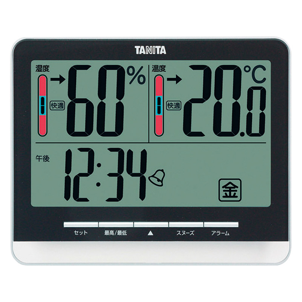 温度・湿度の快適レベルを5段階でお知らせ。過去の最高・最低温湿度を表示。時計機能(スヌーズ機能付)、測定範囲:温度-5.0~45.0度/湿度20~95%、一目盛:温度0.1度/湿度1%。お試し用単4乾電池2本付。