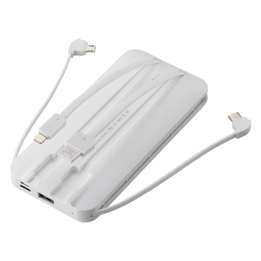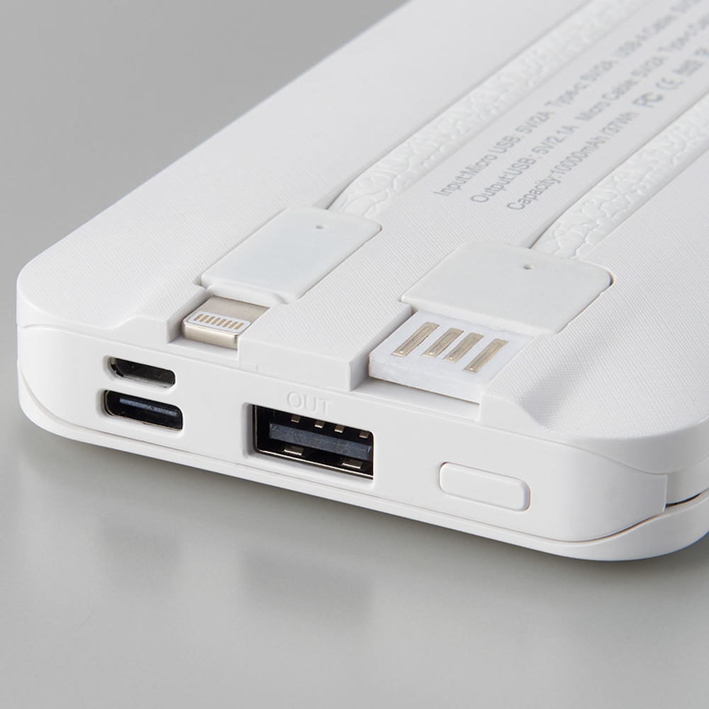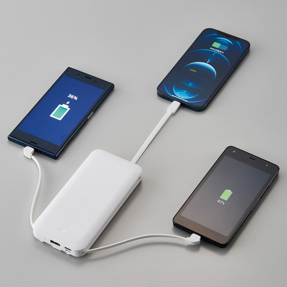 iPhone充電用ケーブル、マイクロUSB充電用ケーブル、USB Type-C充電用ケーブル、本体充電用USBケーブルが全て本体に内蔵されており、ケーブルを別で持ち運ぶ必要なし。