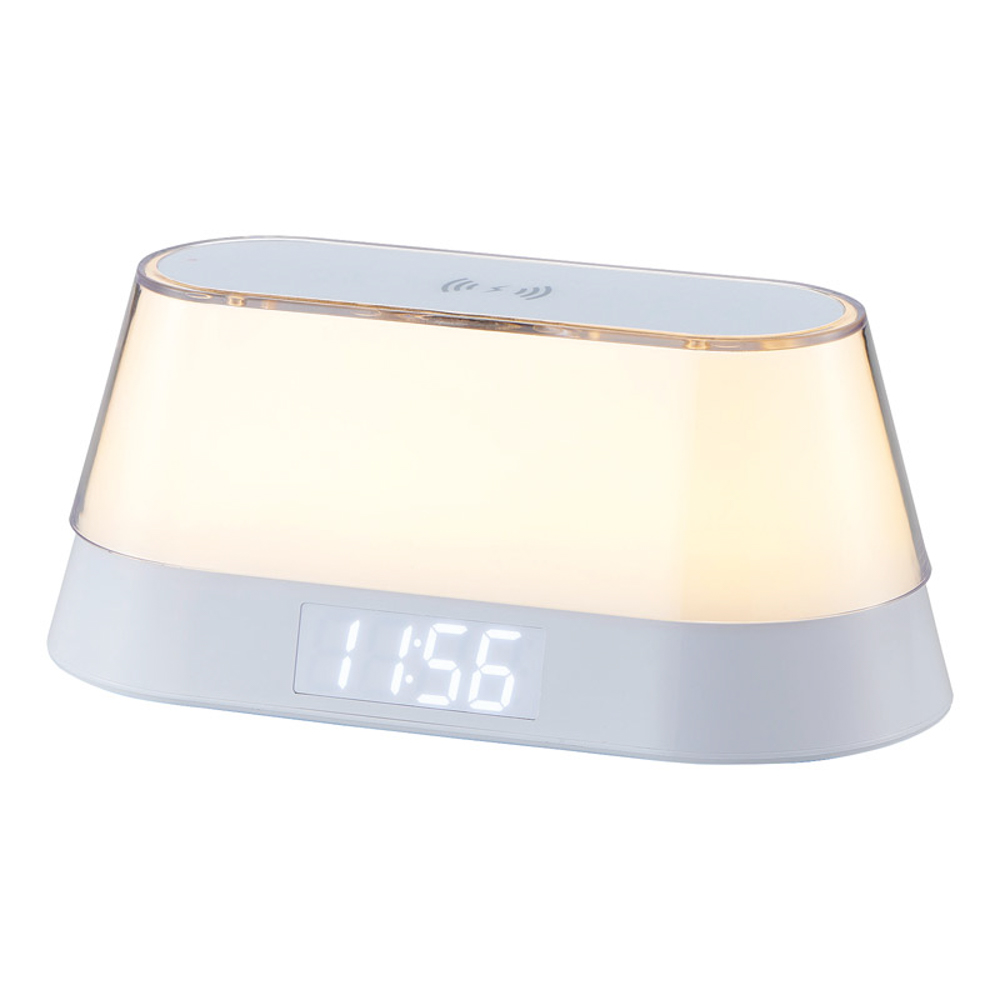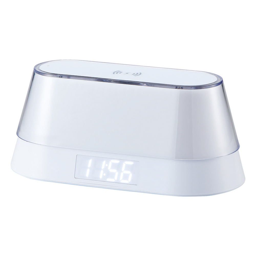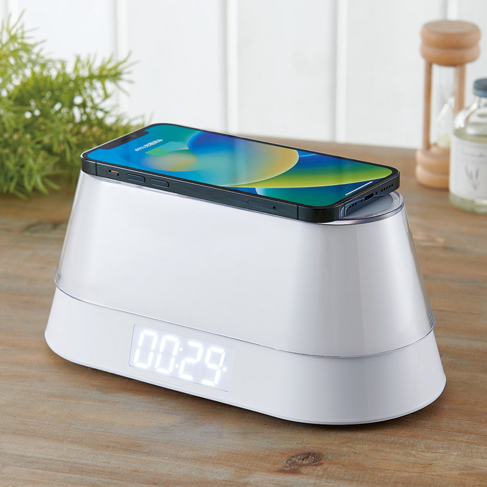 ワイヤレススピーカー、ワイヤレス充電(最大10W)、ナイトライト機能(7色)、時計、アラーム、スヌーズ・アラーム連動ウェイクアップライトの付いた便利なオールインワン多機能クロックです。USBコード×1付。