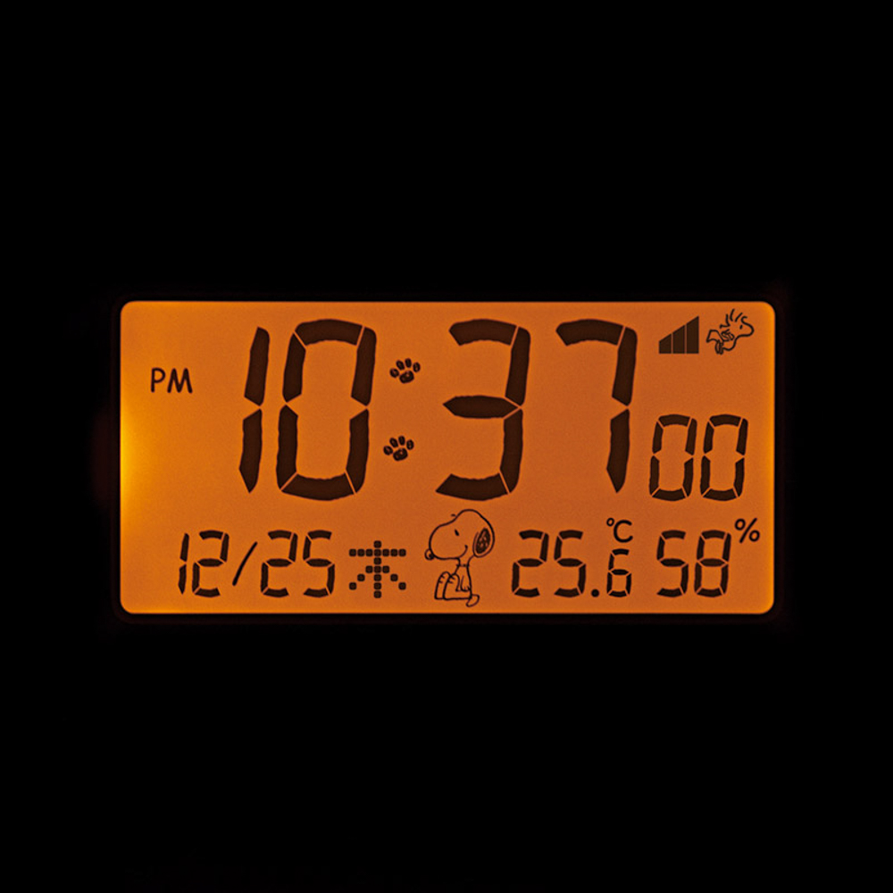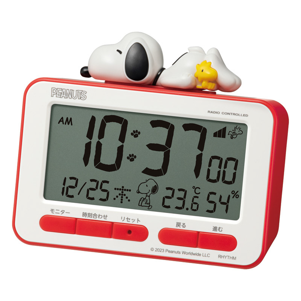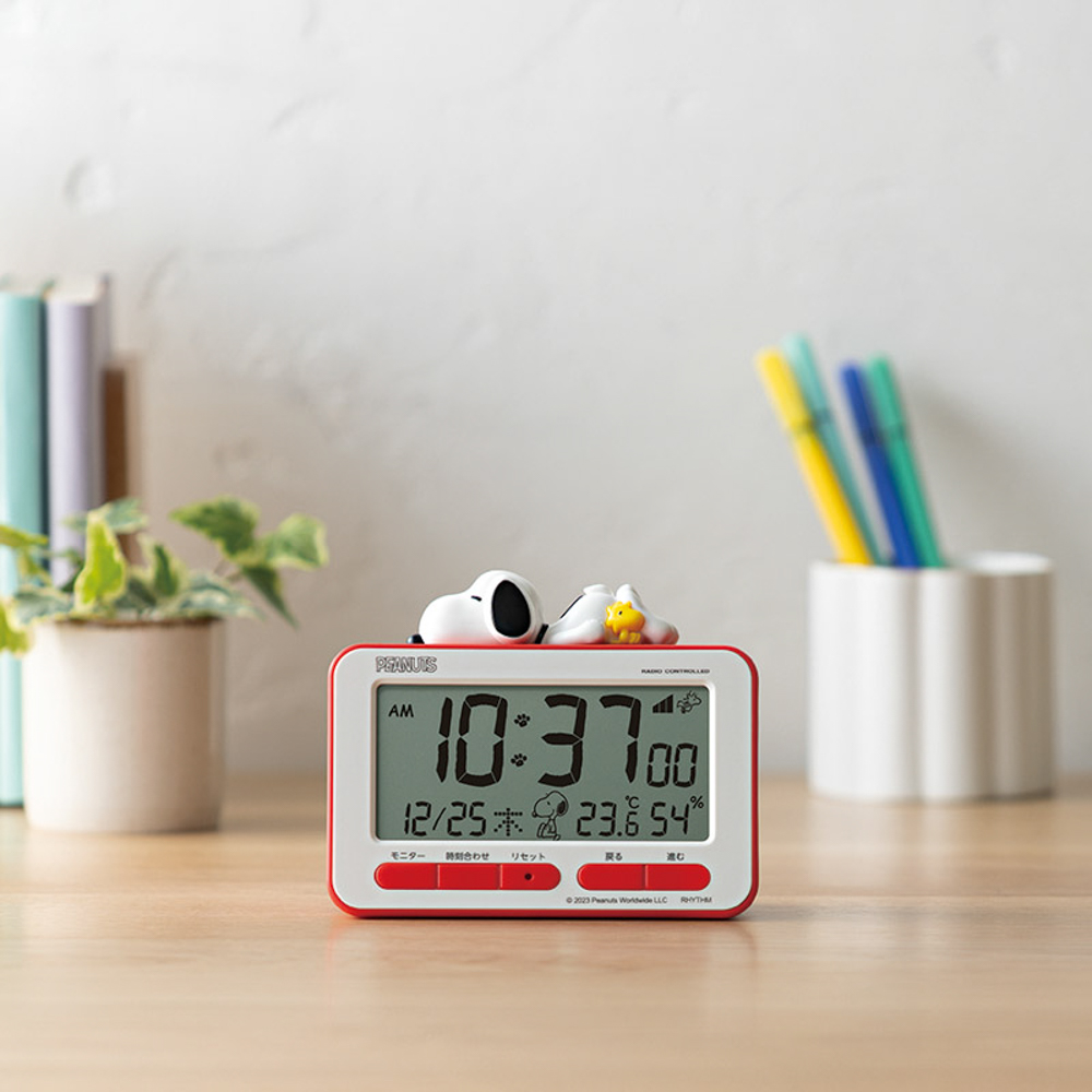スヌーピーとウッドストックのフィギュアが付いた電波デジタルめざまし時計です。