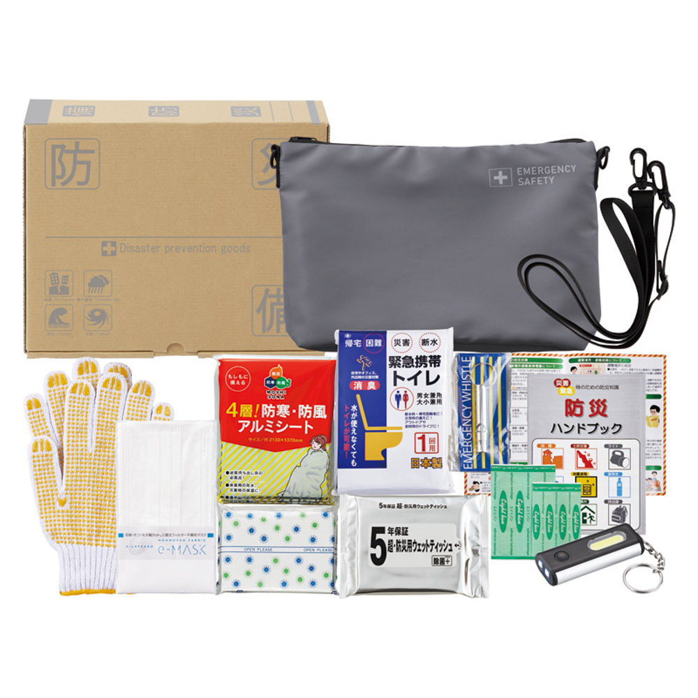 | 内容量 | 21.2×27.3×6.8cm・サコッシュバッグ(18.2×28.7×4.5cm)、2WAYフラットライト、ホイッスル、軍手、防寒アルミシート、ウェットティッシュ(20枚)、携帯トイレ(大小兼用)1P、ポケットティッシュ、エイトバン(大小×各2)、防災ハンドブック、マスク・ポリエステル、他 |