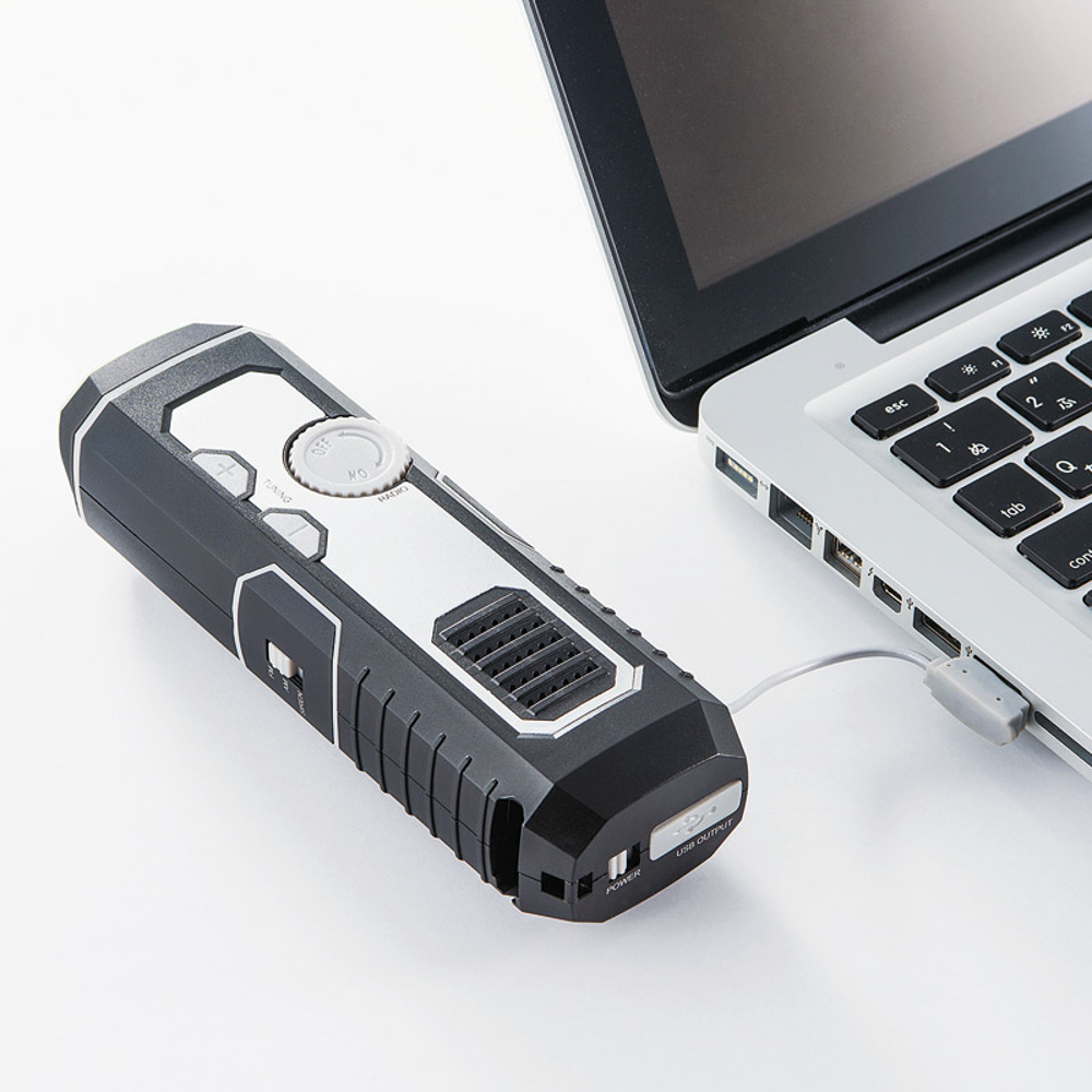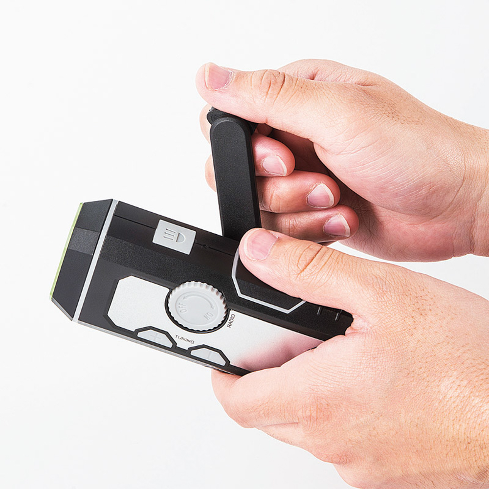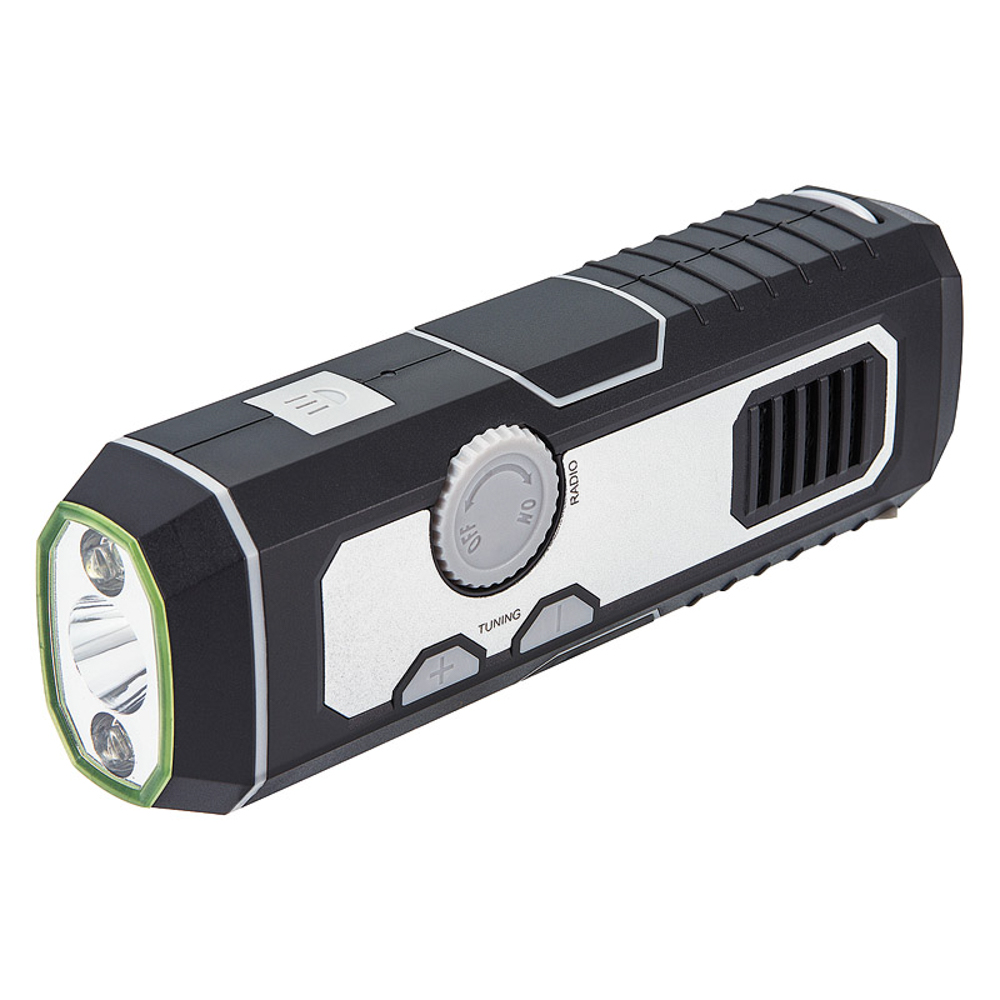 携帯しやすい多機能LEDライト。ラジオはAM・FM対応。ダイナモ充電式で乾電池いらず。ライトは近・遠の2ポジション。USB充電も可能。サイレン付でいざという時にも役に立つ。ダイナモ1分間充電:ライト15分、ラジオ10分、サイレン5分。