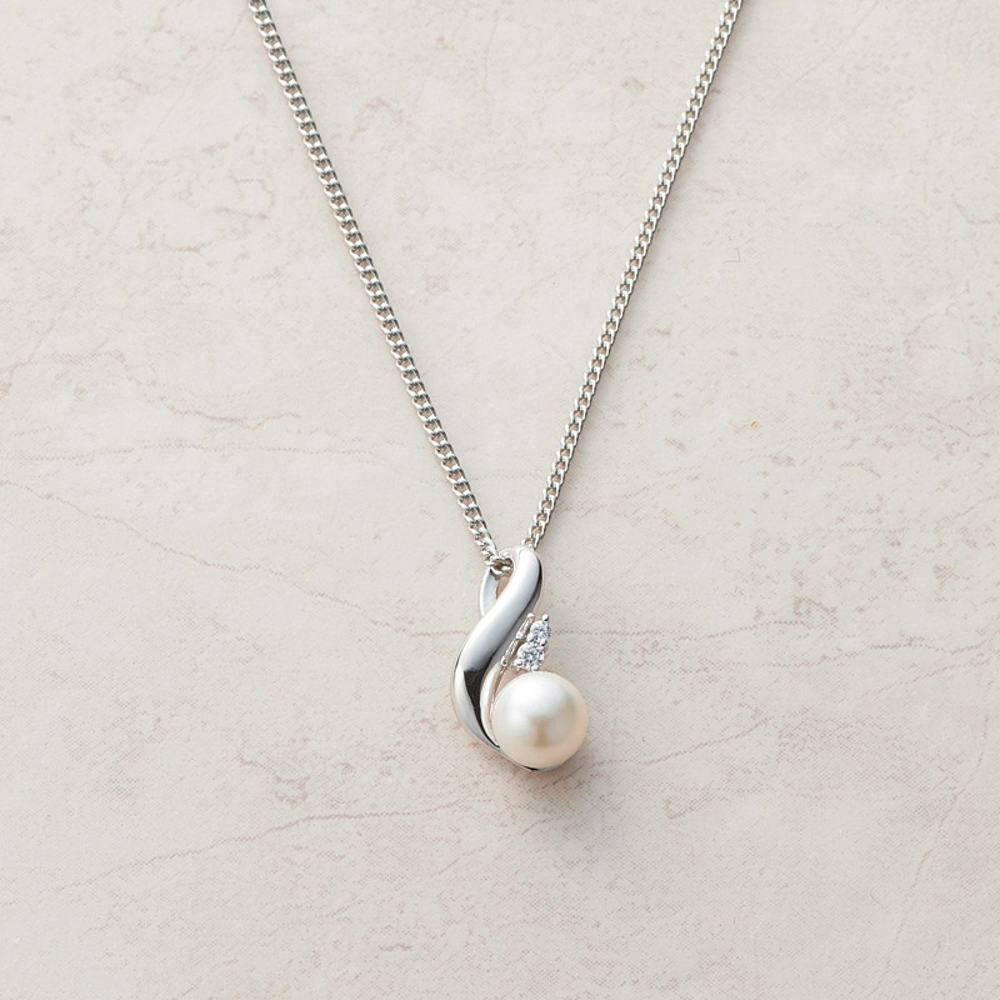 ウェーブラインの美しいシルバー台の先端にアコヤ真珠を配し、バランスよくキュービックジルコニアをあしらいました。