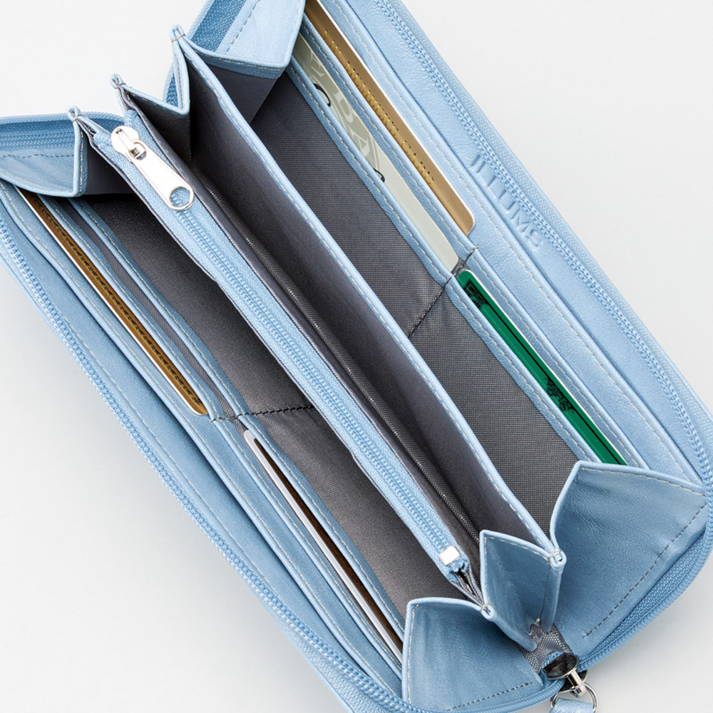収納力に優れたラウンドファスナー長財布は、小銭やカードをたくさんいれたいかたに、おすすめです。ファスナー開閉式。札入×2室、ファスナー式小銭入・外オープンポケット×各1室、カード入×8室、オープンポケット×3室。