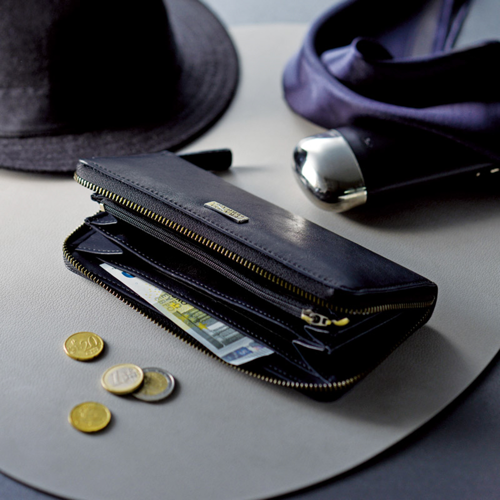 素材の風合いも凝った収納性のあるラウンドファスナー長財布です。