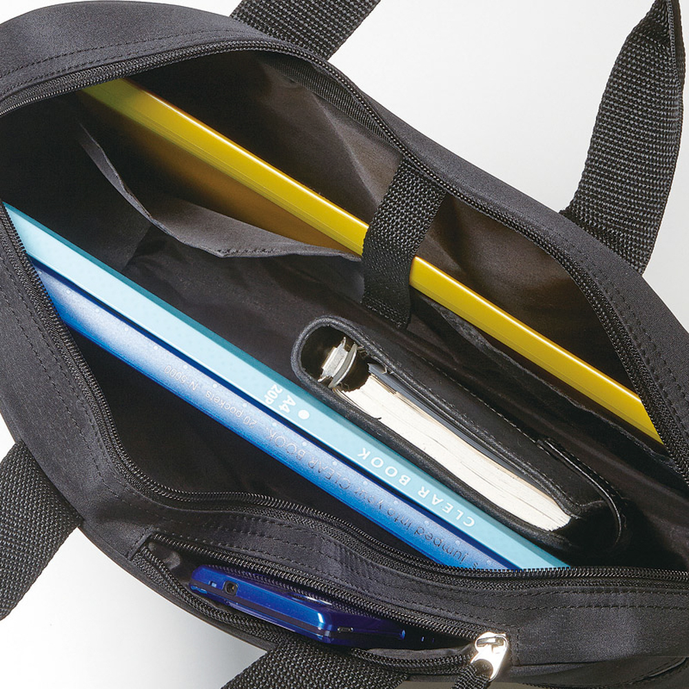 A4ファイルが収納出来るサイズでシンプルなデザインの2WAY軽量ビジネスバッグ。ファスナー開閉式。内面ファスナー付ポケット・外面ファスナー付ポケット×各1室、外ファスナーポケット×2室。ショルダーベルト(着脱可・長さ調節可)付。