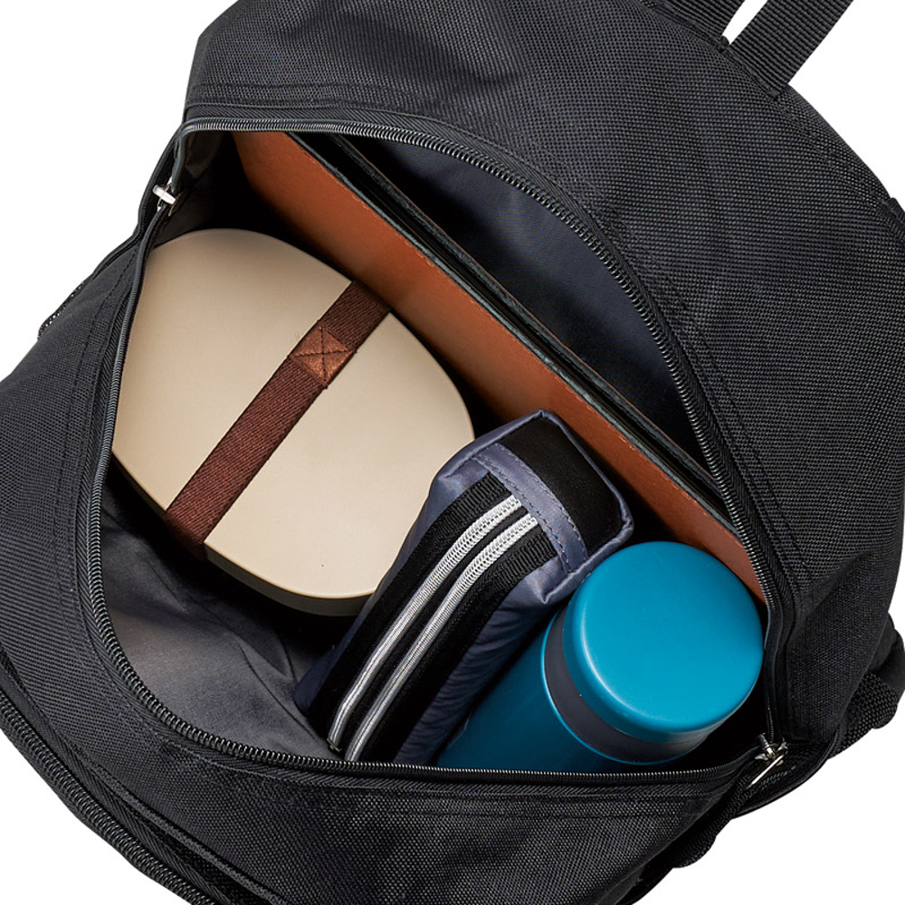 フロントには大きなファスナーポケットが付いた使いやすい機能的なデイパックです。