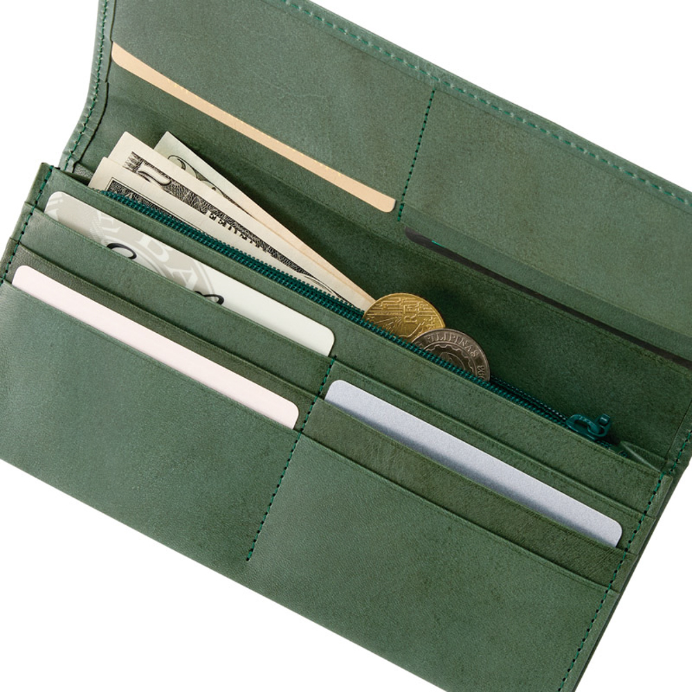 札入×1室、カード入×10室、ファスナー式小銭入×1室、オープンポケット×2室。