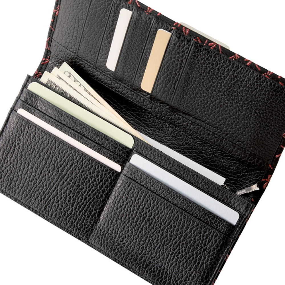 札入・ファスナー式小銭入×各1室、カード入×12室、内ポケット×2室。