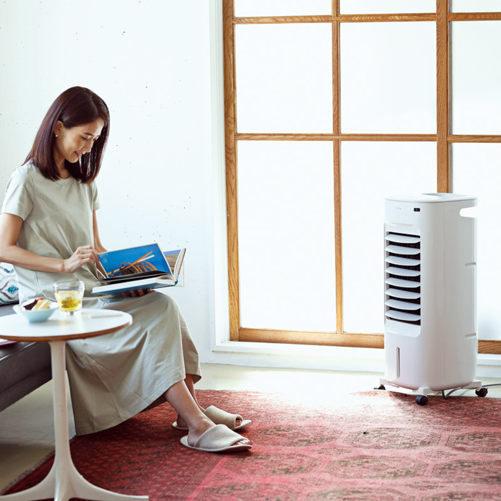 夏は水分を含んだ冷たい風でひんやり涼しく、冬は暖めながら加湿してくれる、1年中使える温冷風扇です。