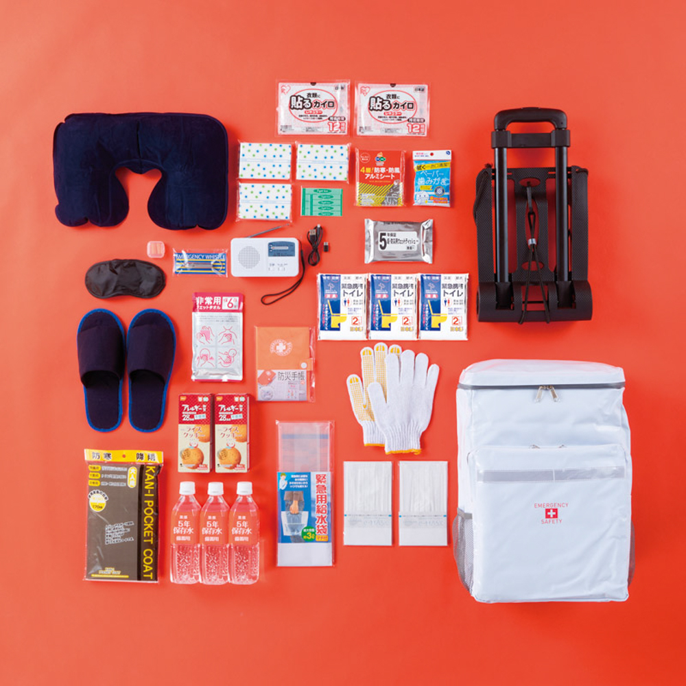 | 内容量 | ターポリンリュックバッグ(45×30×20cm)、キャリーカート、ダイナモエマージェンシーライト、ホイッスル、防災手帳(ハンドブック・IDカード付)、携帯トイレ(大小兼用)2P×3、防寒アルミシート、ウェットティッシュ(20枚)、ペーパー歯磨き(5包入)、軍手、使い捨てカイロ×2、レインコート、エイトバン(大小×各2)、非常用ウェットタオル、マスク×2、首枕、アイマスク、耳栓、スリッパ、備蓄用飲料水(500ml)×3、ライスクッキー×2、ポケットティッシュ×3、給水袋(3L)・ポリエステル、他 |