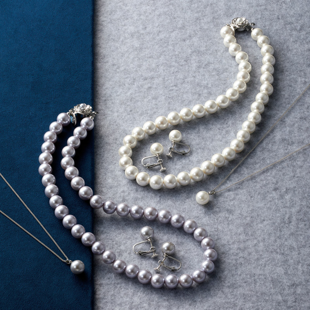 | 内容量 | ネックレス(全長約44.3cm)・ペンダント(全長約40cm)・イヤリング(1.4×2.2cm)×各2・貝パール(径約10mm)、ネックレス・ペンダント:真鍮(ロジウム色メッキ)、イヤリング:シルバー925 |