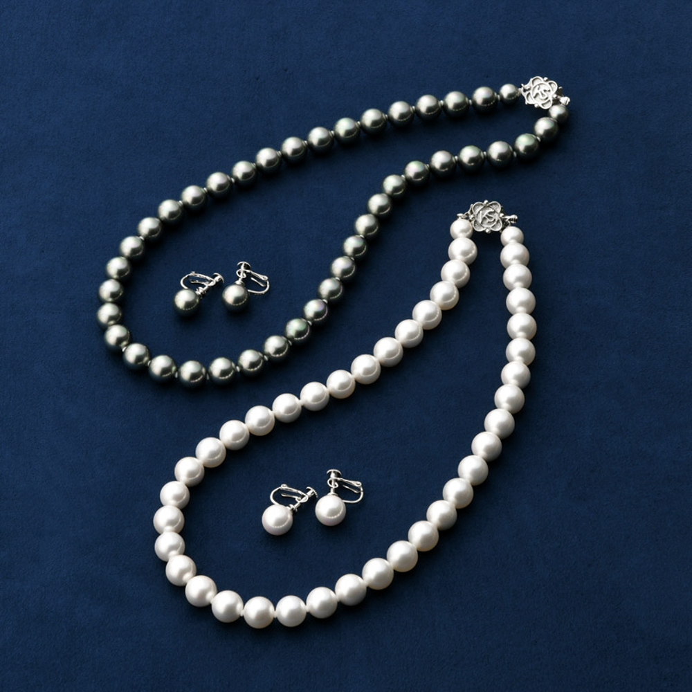 貝パールの中でも特に輝きの美しい珠を使ったネックレスとイヤリングのセット。