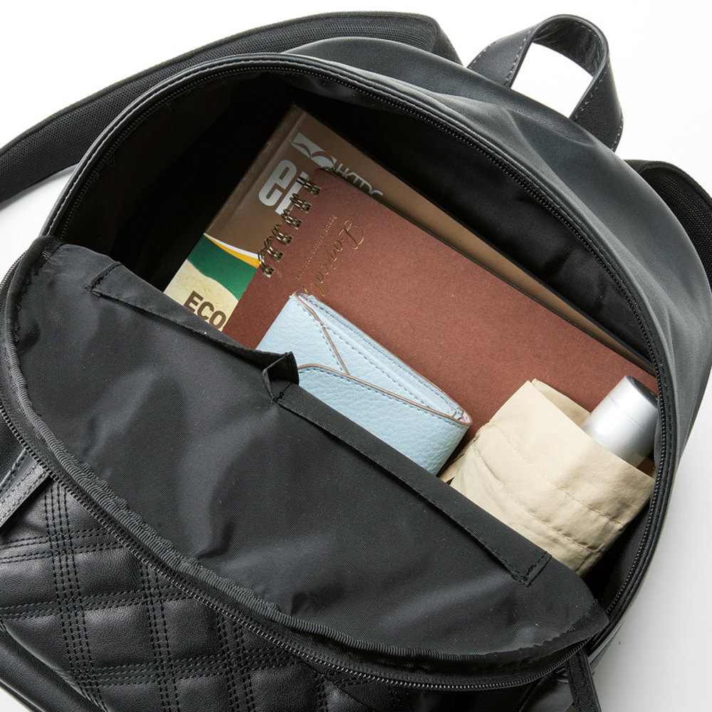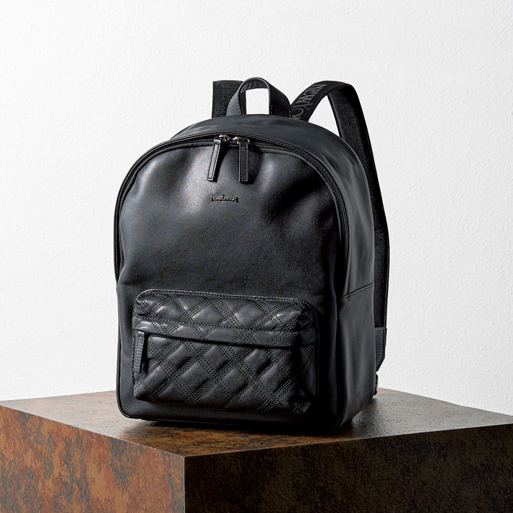 ニューヨーカーのハウスタータン柄をキルトで表現したリュックサック。レザー仕様で更に高級感を演出。ダブルファスナー開閉式。前面ファスナーポケット・内ファスナーポケット×各1室、内オープンポケット×2室。ショルダーベルト着脱不可(長さ調節可)。