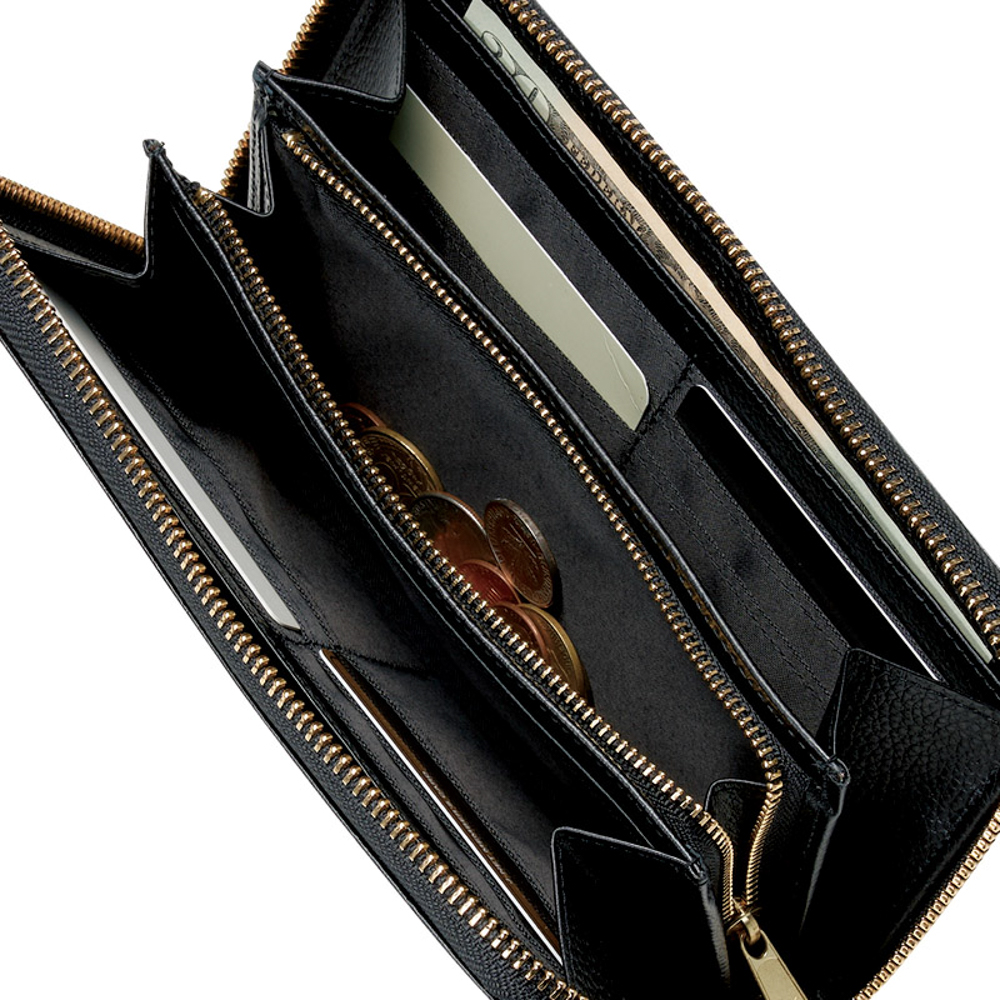 札入×2室、ファスナー式小銭入×1室、カード入×12室、ポケット×6室。