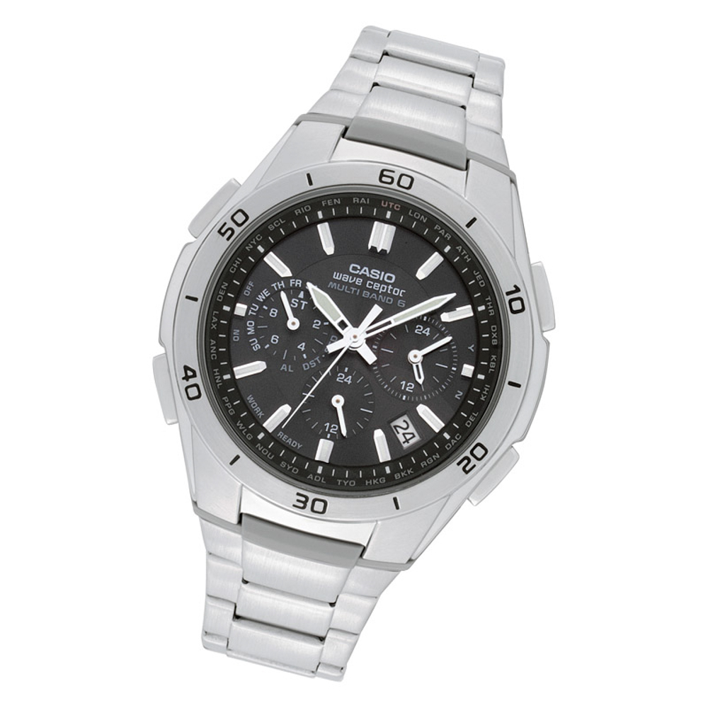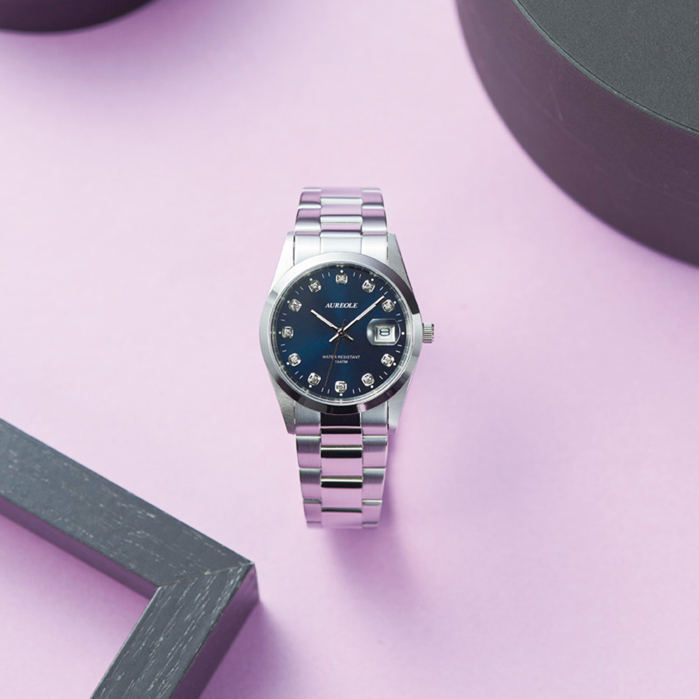 10気圧防水ながらブルー文字盤のインデックスに留められたクリスタルが煌めく、ドレッシーな表情のメンズファッションウォッチ。