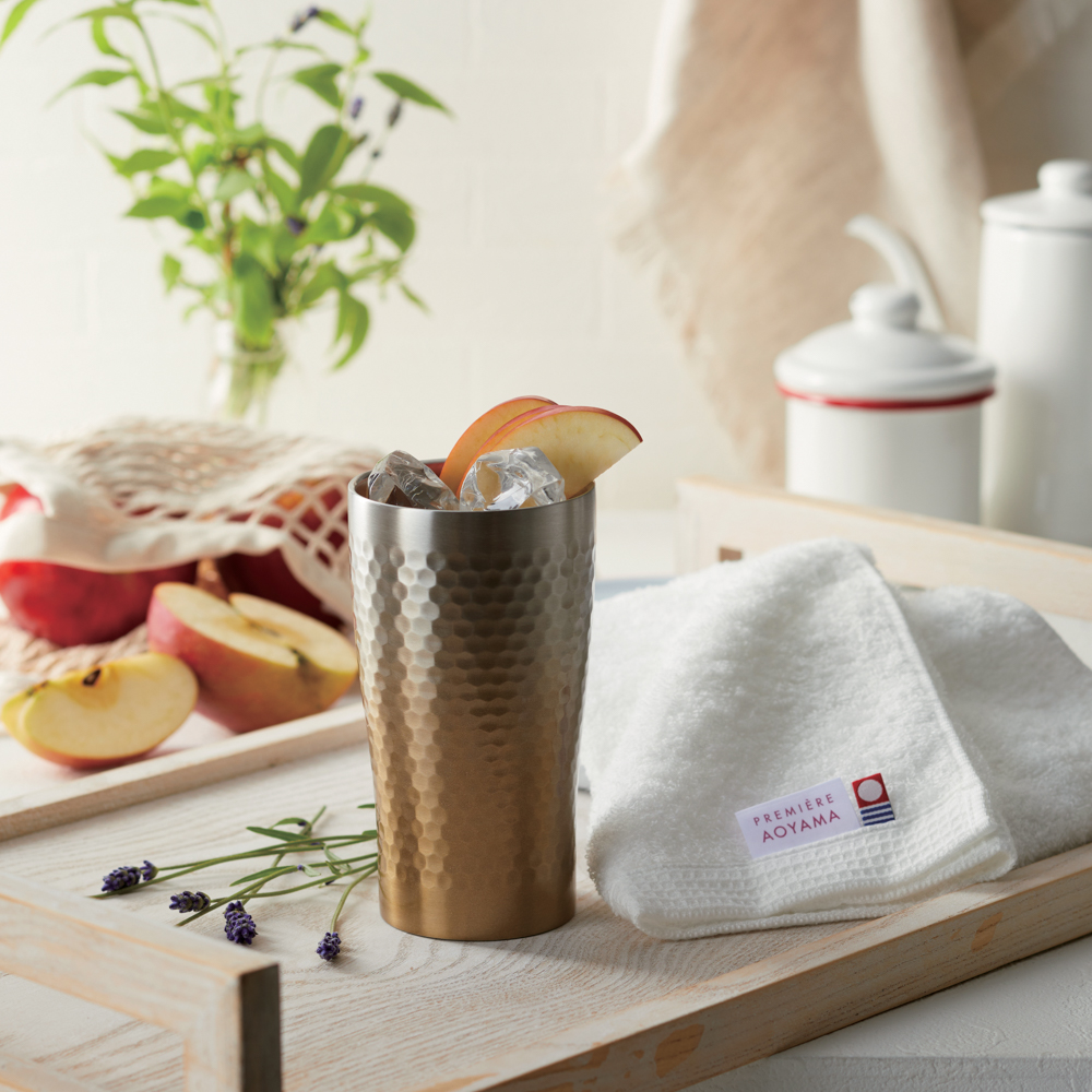 真空断熱二重構造タンブラーと今治タオルのセット。