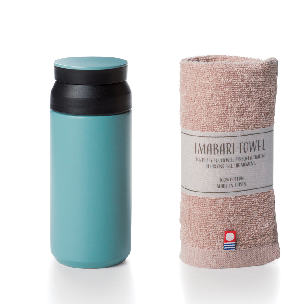 保温・保冷性に優れた真空二重構造のシンプルで使いやすいステンレスボトルと吸水性に優れた今治タオル。