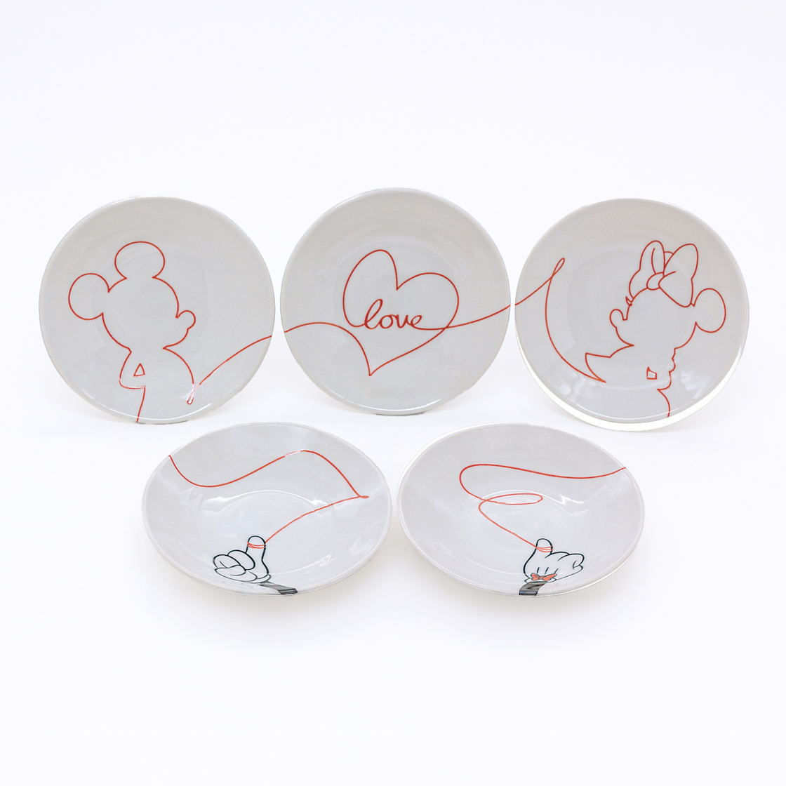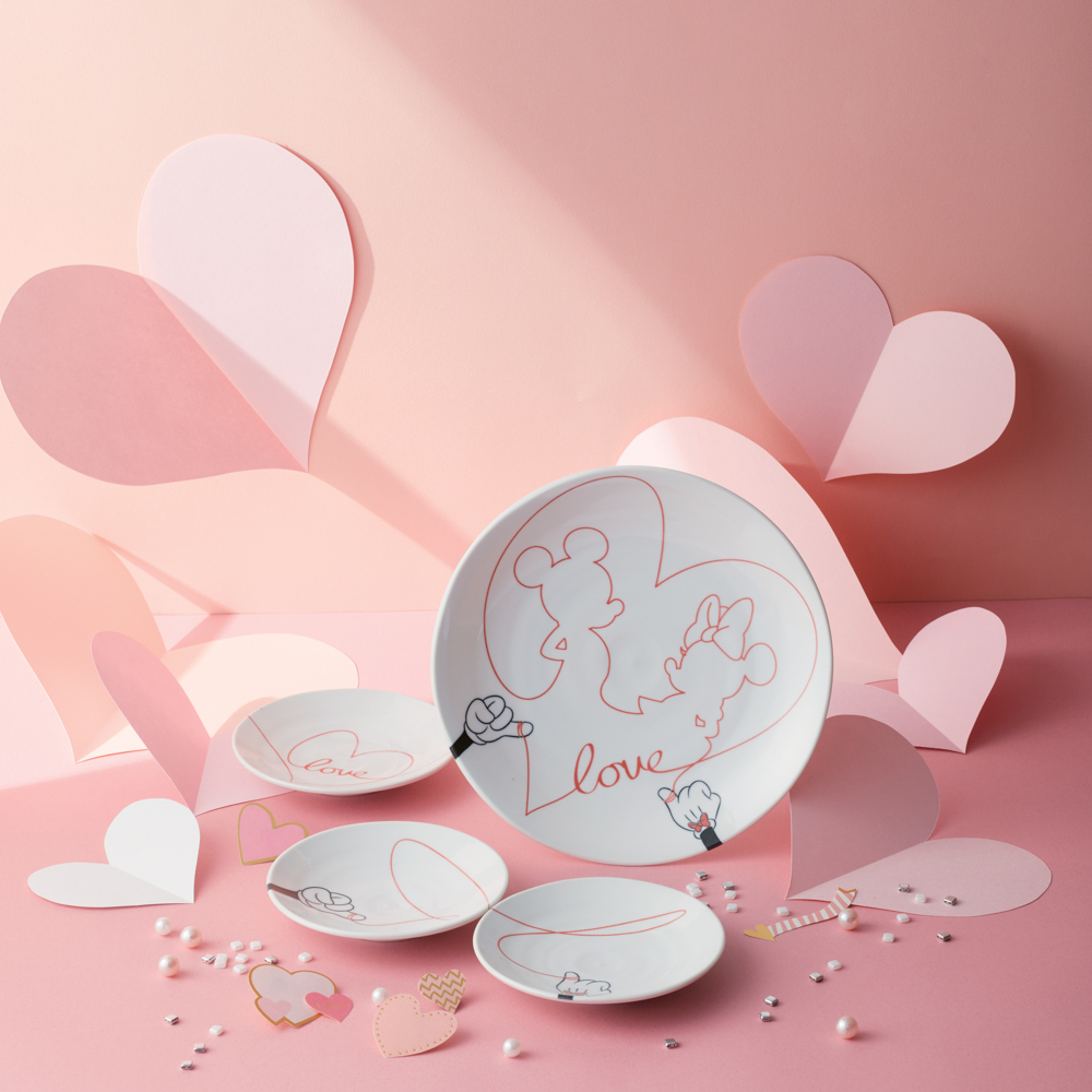 「ラブイズ」は、ミッキーマウスとミニーマウスの左手の薬指を結ぶ赤い糸をテーマにしたデザインのテーブルウェア。