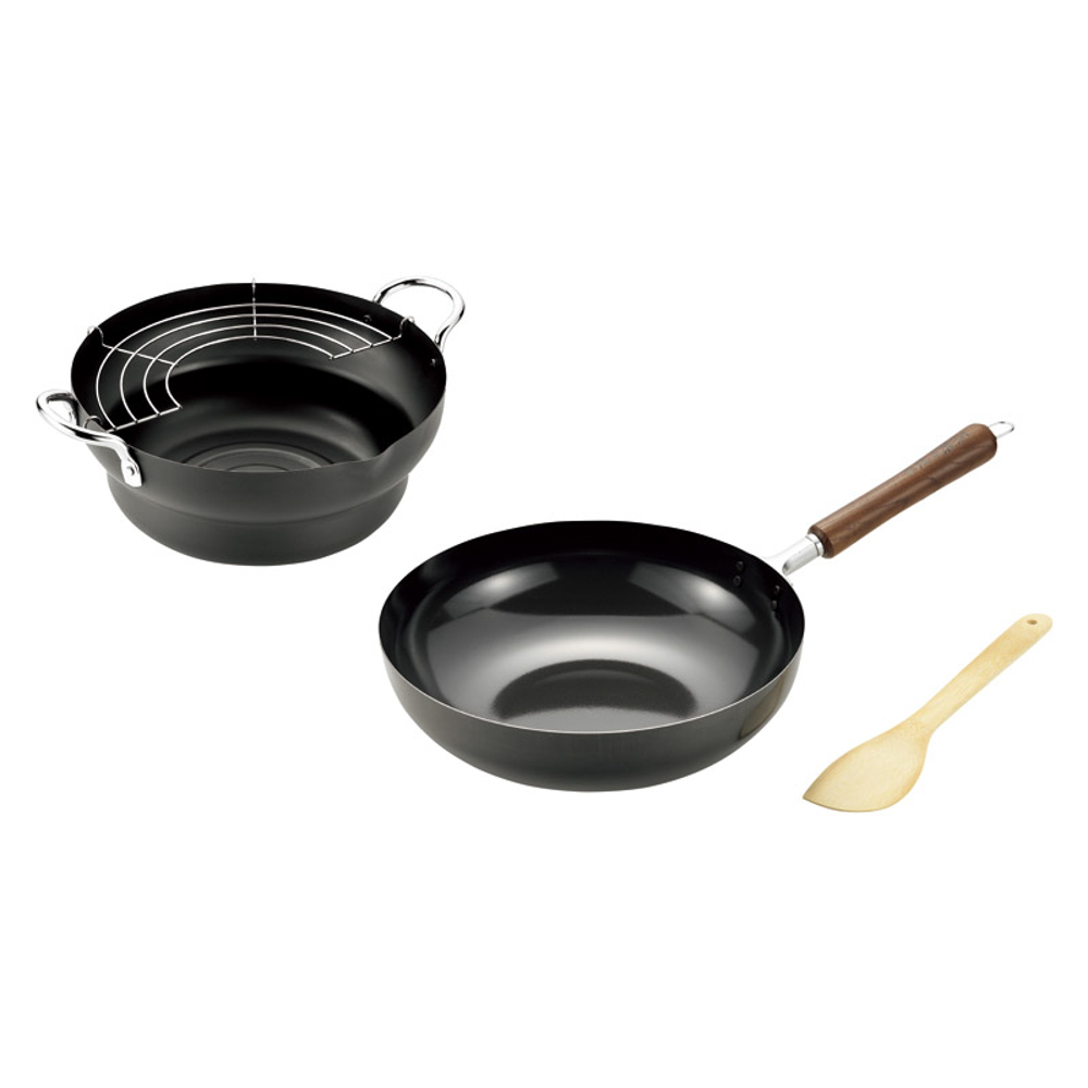 | 内容量 | いため鍋28cm(28×49.5×13cm)・天ぷら鍋24cm(24.3×30.8×11cm・3.3L)×各1・鍋:鉄(シリコン樹脂塗装)、竹べら:天然木、半月アミ:鉄(クロームメッキ) |