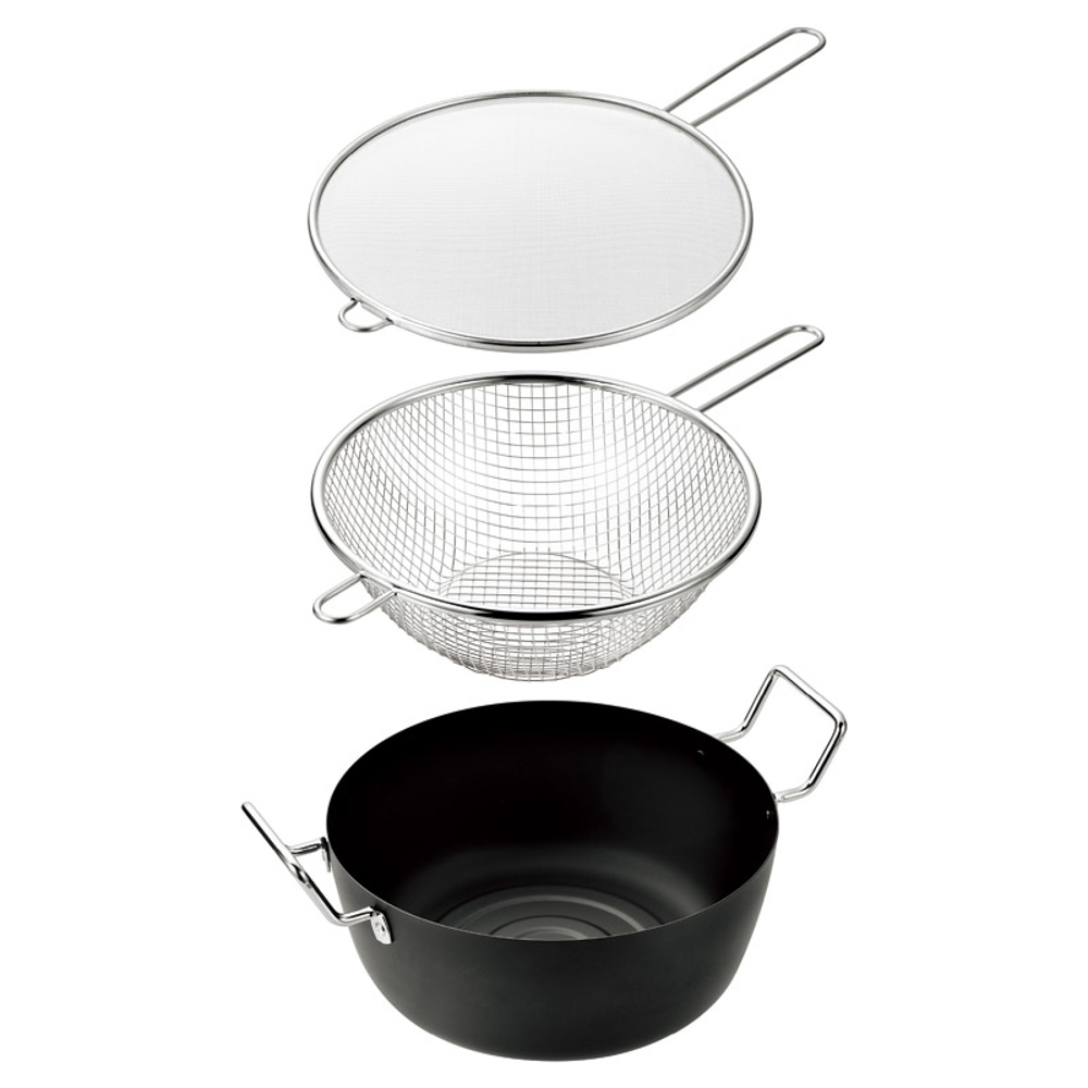 | 内容量 | 深型天ぷら鍋22cm(22×30×12cm・2.9L)・手付きフライヤー・油はねガード×各1・深型天ぷら鍋22cm:鉄(シリコン樹脂塗装)、手付きフライヤー・油はねガード:ステンレス鋼 |