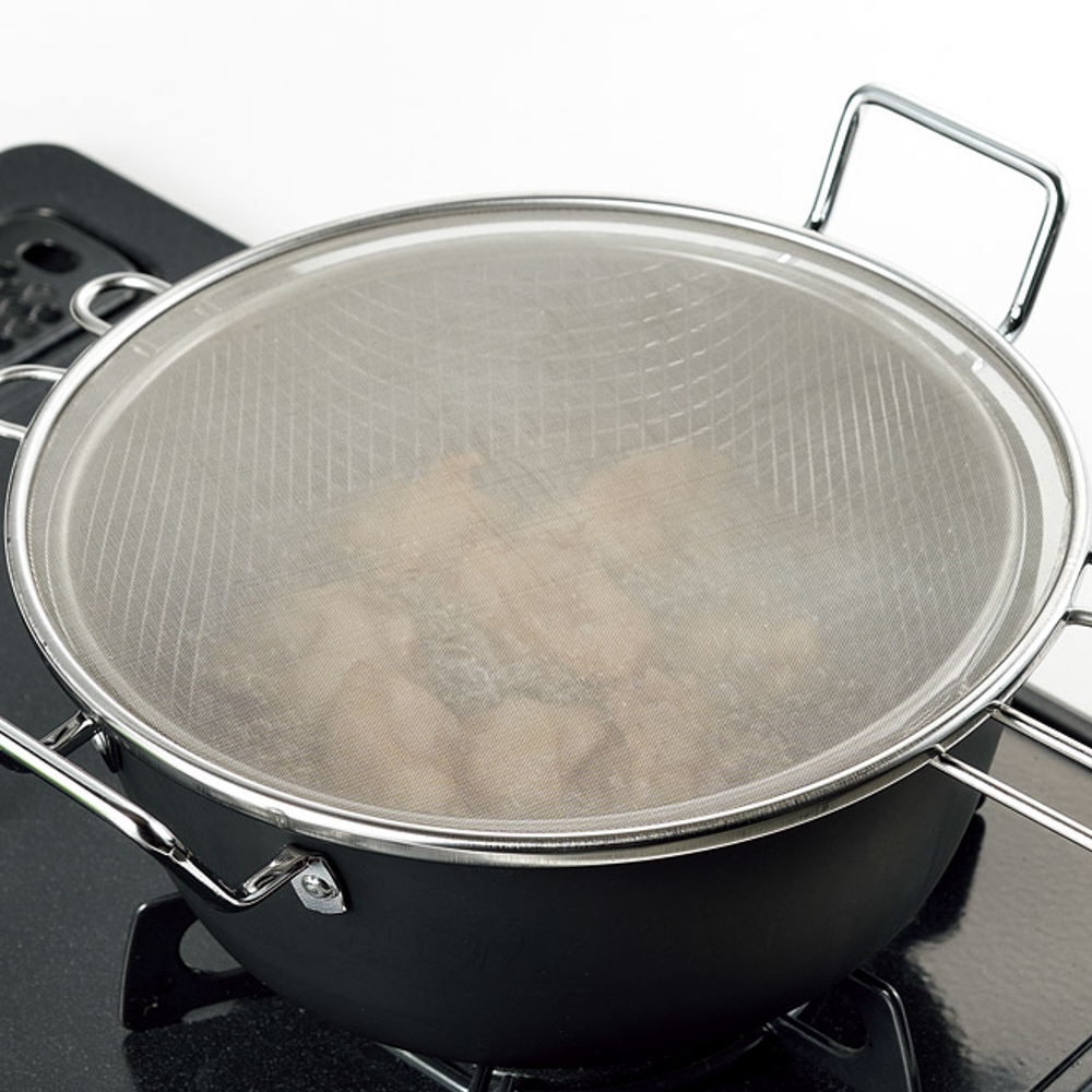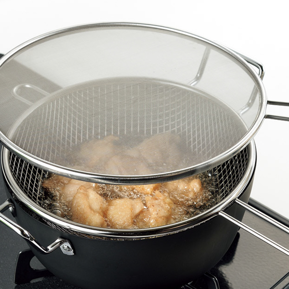 一度にたくさんの食材の油切りができる手付きフライヤーと、細かいメッシュで油はねを防ぐ油はねガードのセット。