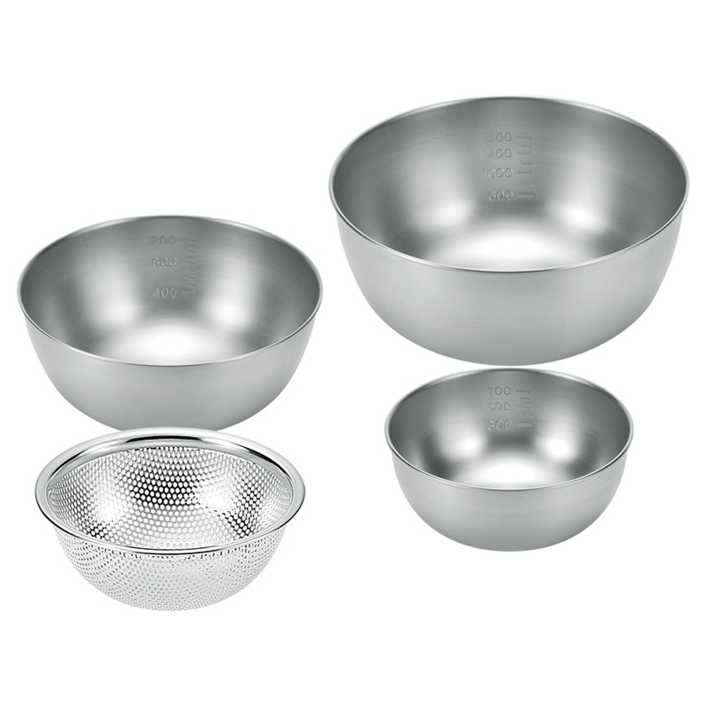 | 内容量 | ボウル21cm(径22×9.5cm・2.8L)・ボウル18cm(径19×8cm・1.6L)・ボウル15cm(径15.7×6.5cm・1L)・パンチングボウル15cm(径16×6.4cm)×各1・18-8ステンレス鋼 |