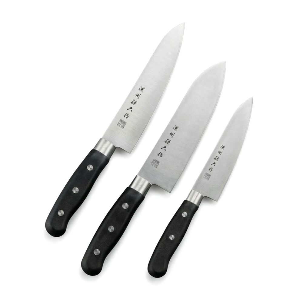 三徳包丁(刃渡17cm)・ペティナイフ(刃渡12cm)・牛刀包丁(刃渡17cm)×各1・モリブデンステンレス刃物鋼、柄:ポリプロピレン