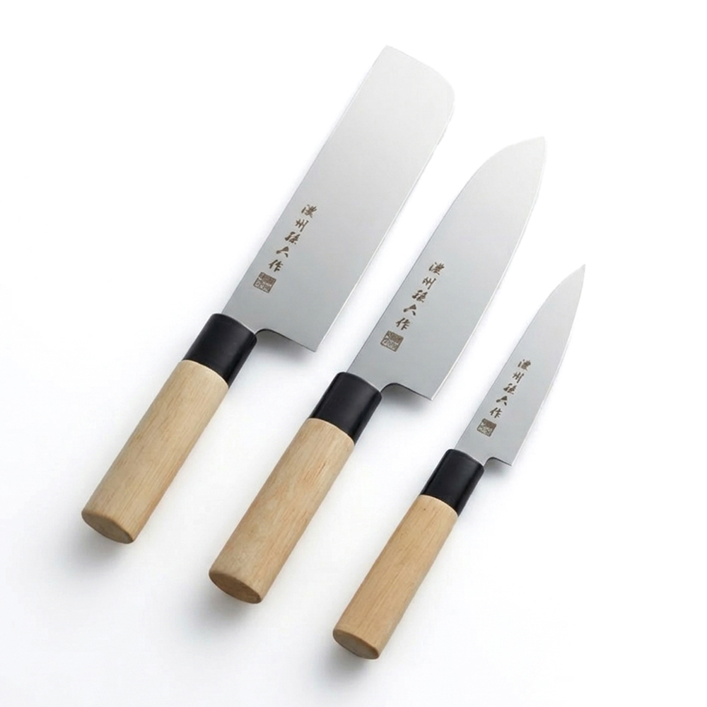 三徳包丁(刃渡16.5cm)・菜切包丁(刃渡17cm)・ペティナイフ(刃渡12cm)×各1・モリブデンステンレス刃物鋼、柄:天然木