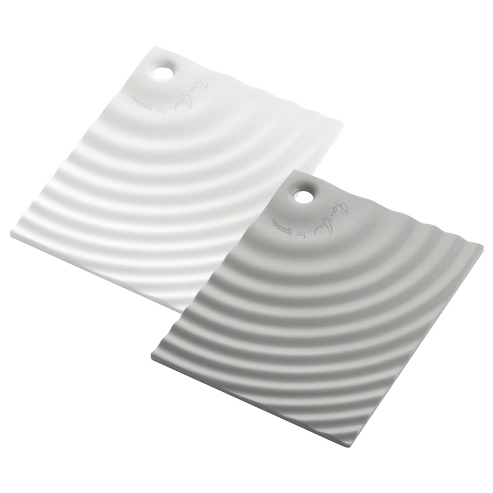 使い勝手の良いエレガントなまな板2個組み。ホワイトとグレーのアソートです。カット作業面と装飾した見せる面の2つの面を持ち、使用しない時には飾り用の面を見せることができます。まな板を立てる便利なスタンドが付いています。