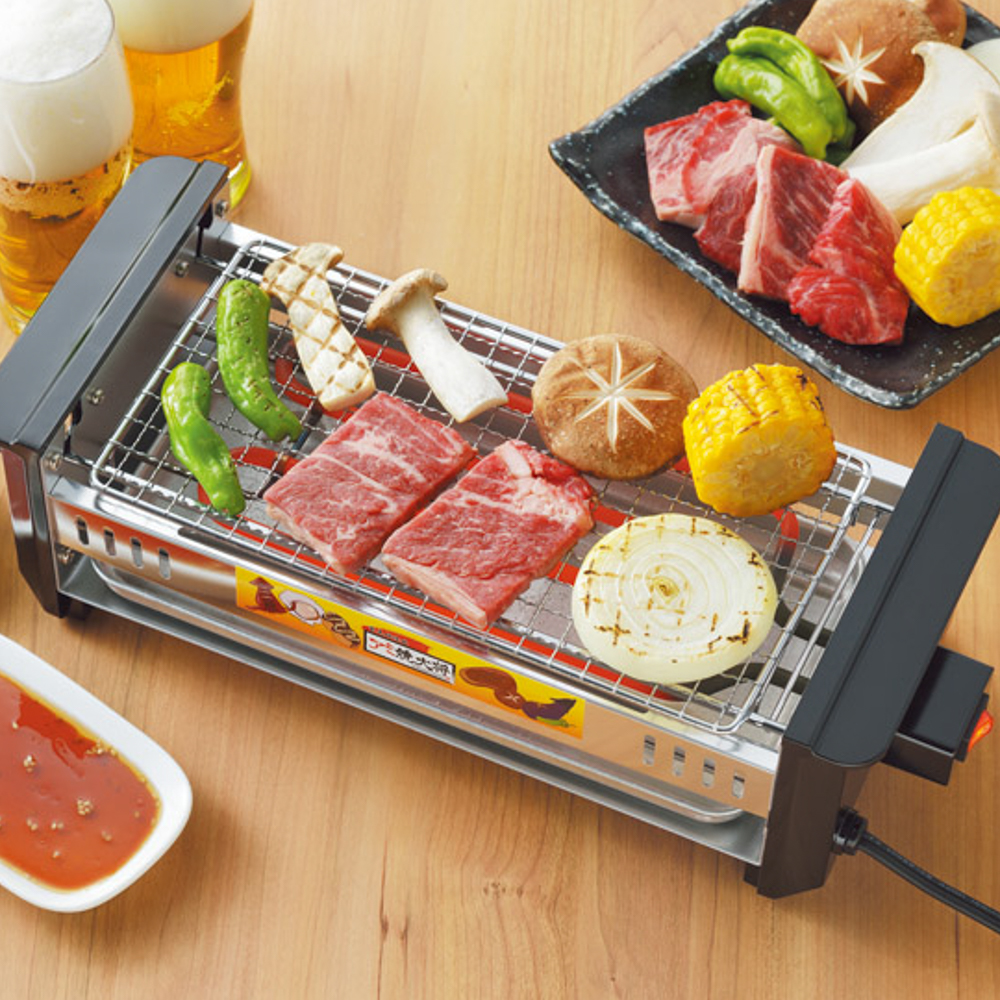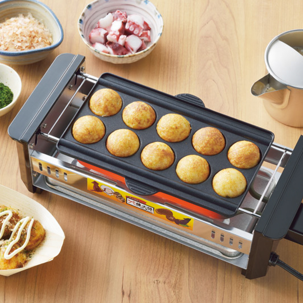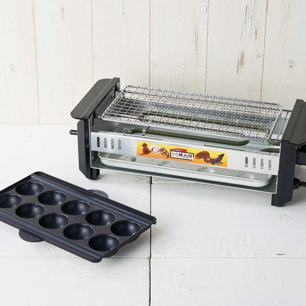 | 内容量 | 本体(38.2×14.6×10.6cm)・油受けトレイ・焼き網・たこ焼きプレート×各1・本体:フェノール樹脂・鉄、油受けトレイ:鉄、焼き網:鉄(クロムめっき)、たこ焼きプレート:アルミニウム合金(ふっ素樹脂塗膜加工) |