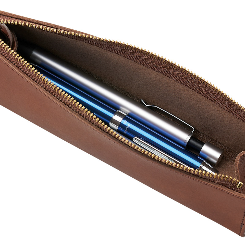革の存在感と三角フォルムで自立するシンプルデザインのペンケースです。