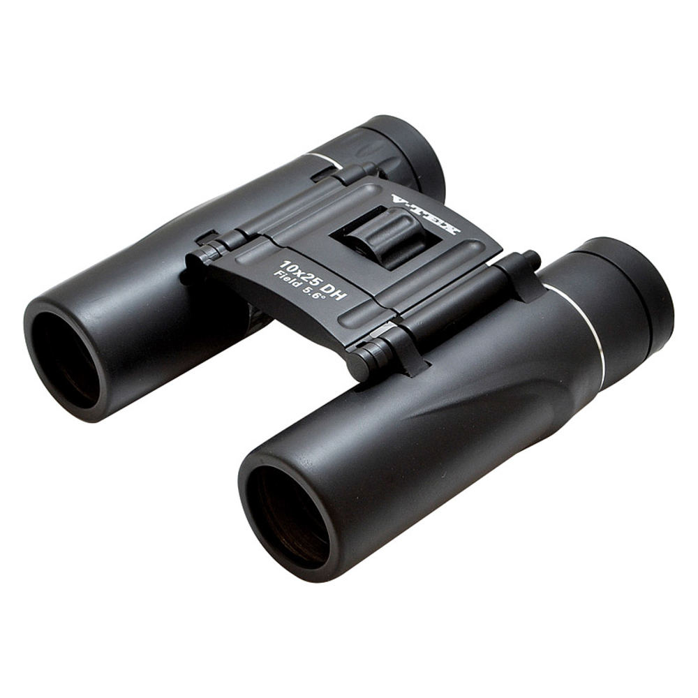 2軸式のダハプリズムタイプコンパクト双眼鏡。収納時は折りたたむことができ、携帯性に非常に優れています。広いコンサート会場やサッカー競技場などに活躍するモデルです。倍率:10倍。有効径:25mm。実視界:5.6度。