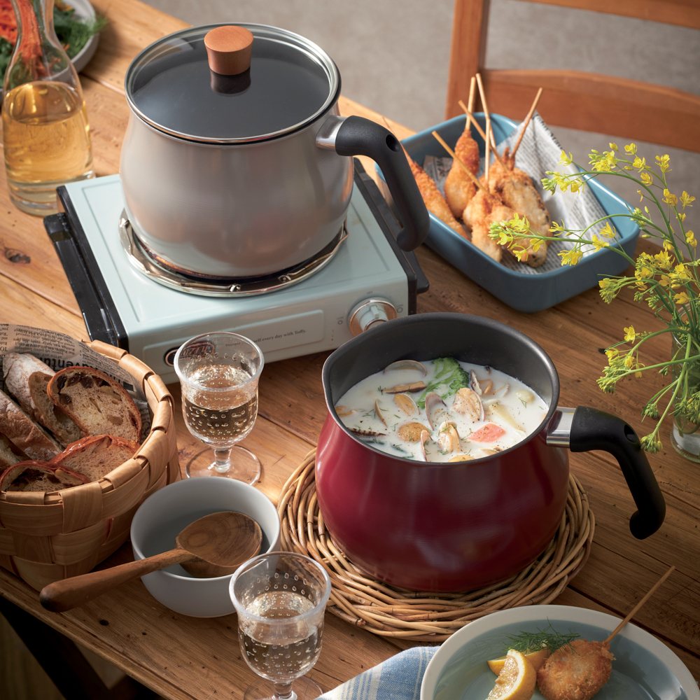 「煮る」「炊く」「沸かす」「揚げる」「和える」「炒める」「茹でる」。コンパクトなのに1台7役の、IH対応で内側フッ素樹脂加工のマルチでかわいい万能ポットです。