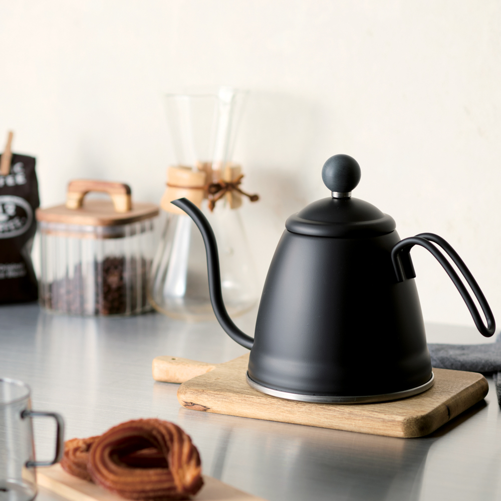 シンプルでスタイリッシュなブラックケトル。ドリップに適した細口ノズル。 カーブを描いたノズルの形状は湯量をコントロールしやすく、狙ったポイントに注ぎやすい。 マットな質感がおしゃれなブラック塗装。 金属加工の街として有名な新潟県燕三条地区で作った日本製です。